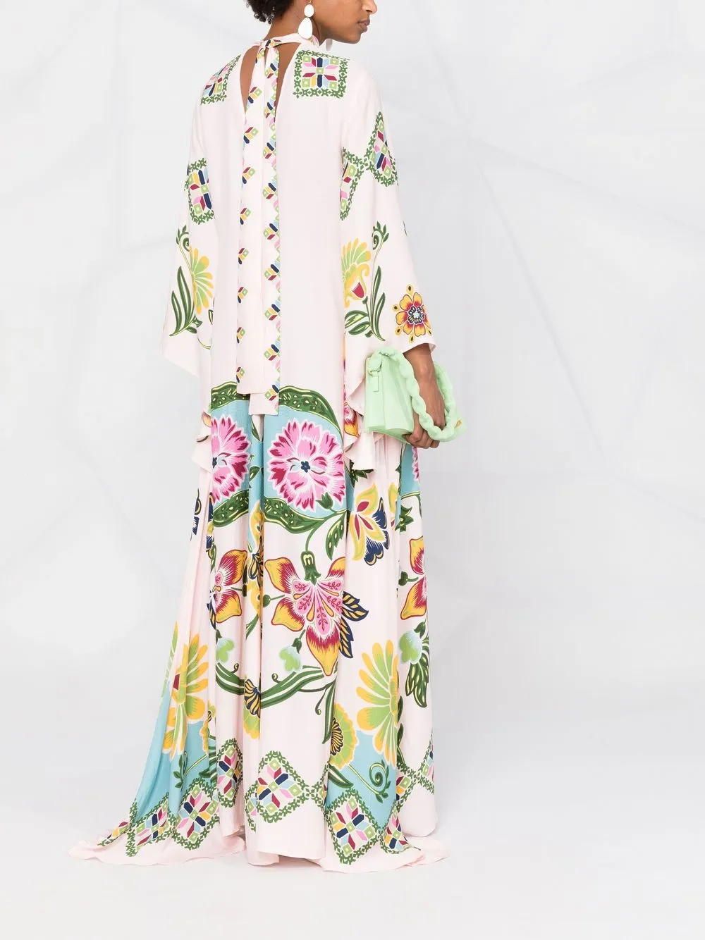 Сплошной цветочный принт, круглый вырез, длинные рукава и длина миди.