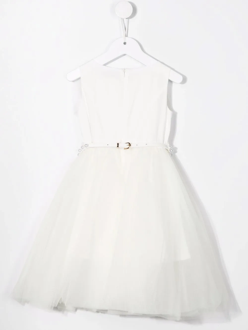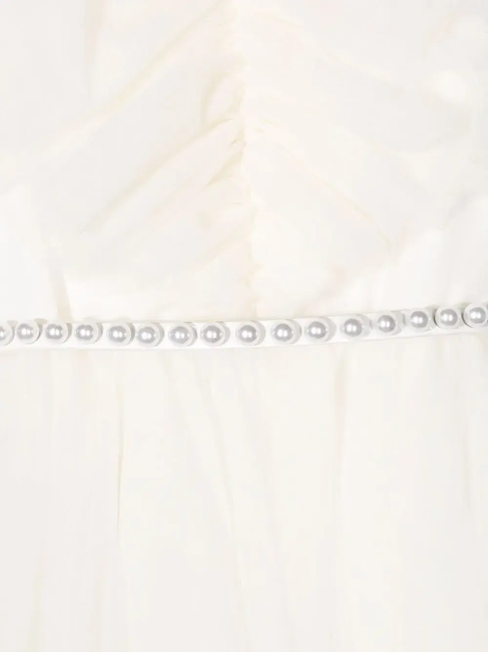 Вставки из тюля, искусственный жемчуг, ремень на талии, круглый вырез и без рукавов. Цвет: белый.
