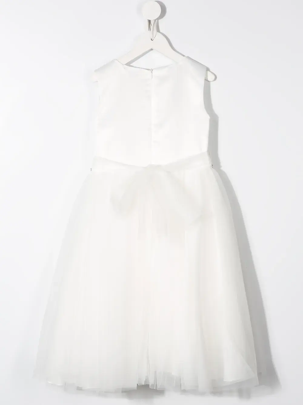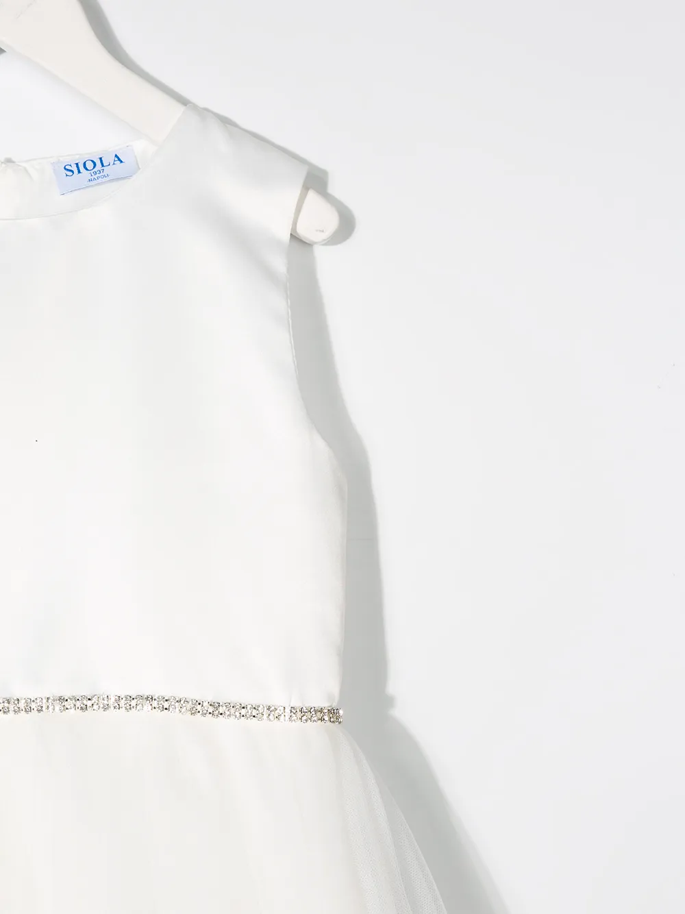 Платье с кристаллами от Siola. Модель без рукавов, круглый вырез, отделка кристаллами, застежка на молнии сзади, расклешенная юбка и короткая длина. Цвет: белый.