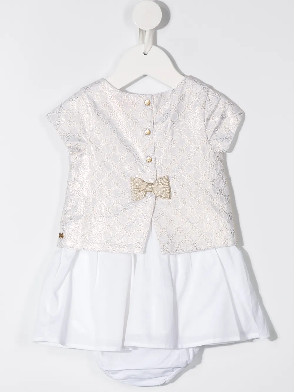 Английская вышивка, круглый вырез, короткие рукава, застежка на кнопках и бант.