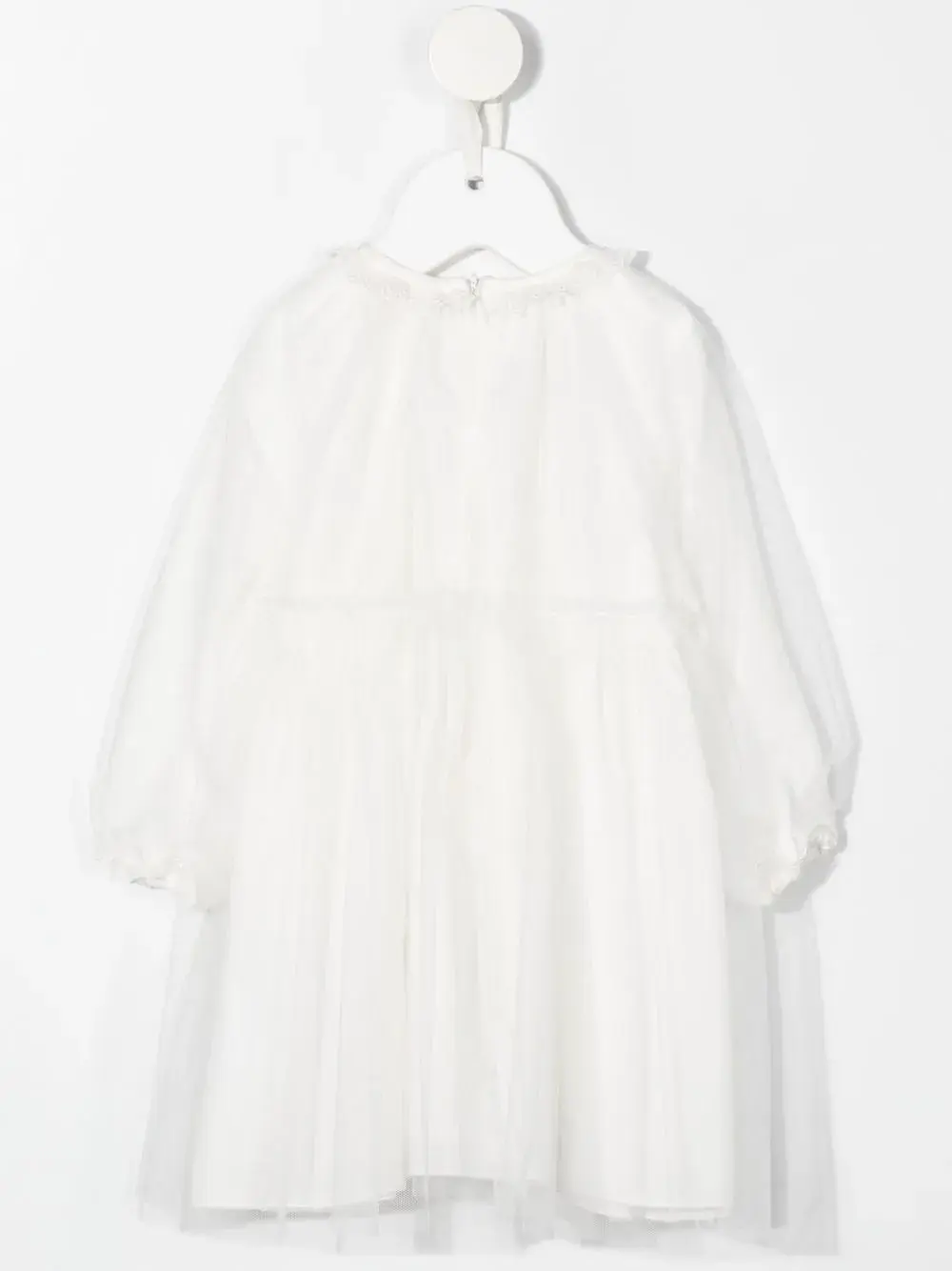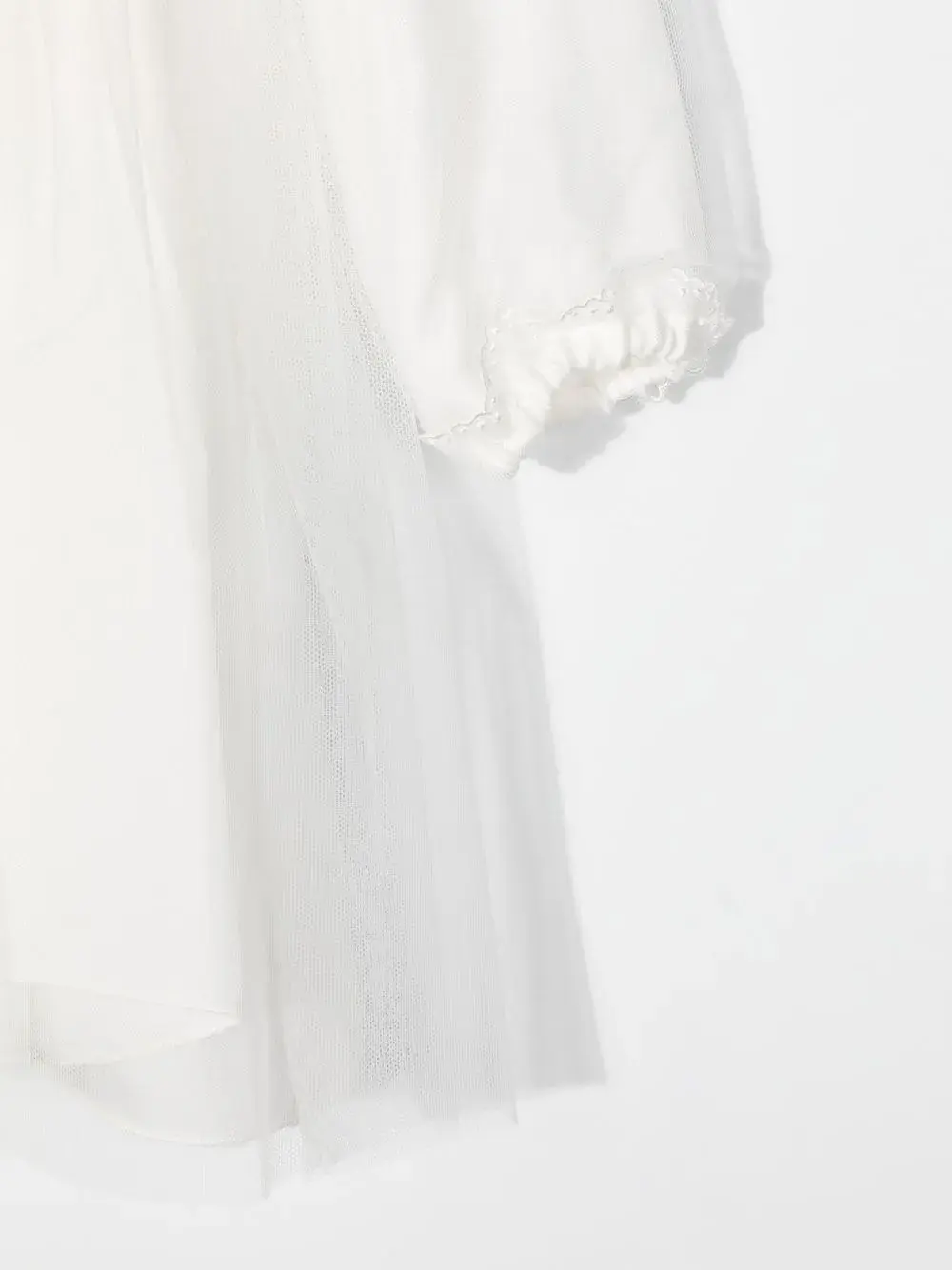 Белый, круглый вырез, воротник с оборками, длинные рукава, эластичные манжеты и верхний слой из тюля.