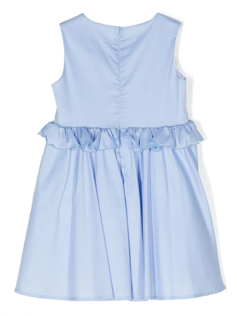Светло-бирюзовый, эластичный хлопок, отделка с оборками, круглый вырез, без рукавов, потайная застежка на молнии сзади, плиссированная юбка и расклешенный подол.