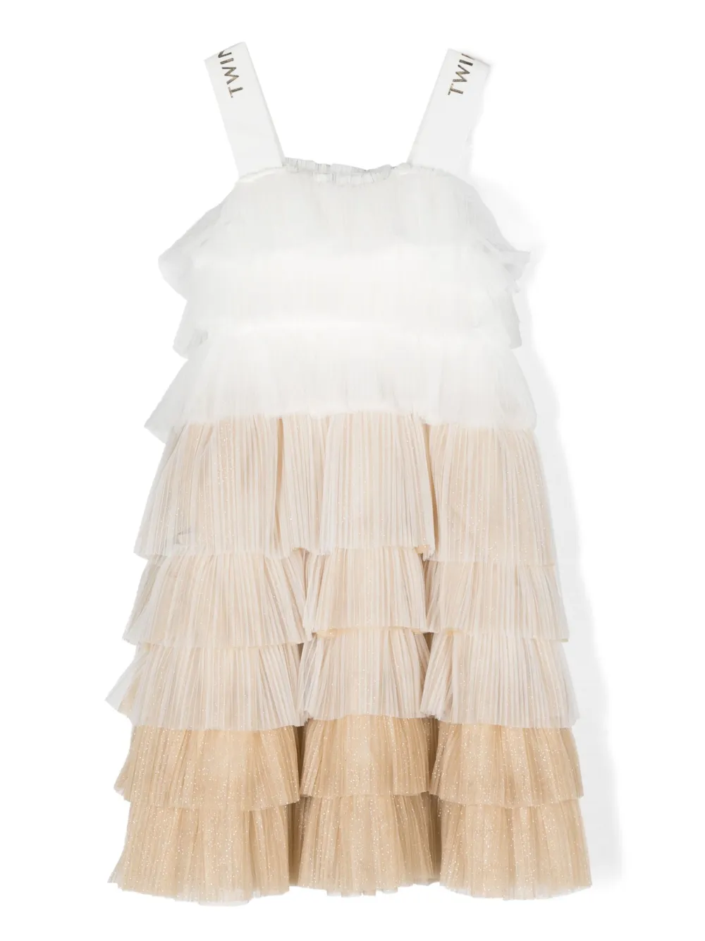 Белый, золотистый, покрытие с эффектом металлик, градиентный эффект, модель с оборками, полупрозрачный верхний слой, без рукавов и два ремня на плечо с логотипом.