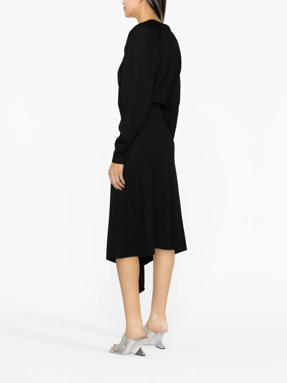 Черный, шерсть, модель на запах, V-образный вырез, завязки по бокам, длинные рукава, разрез спереди, длина до середины икры и асимметричный подол.