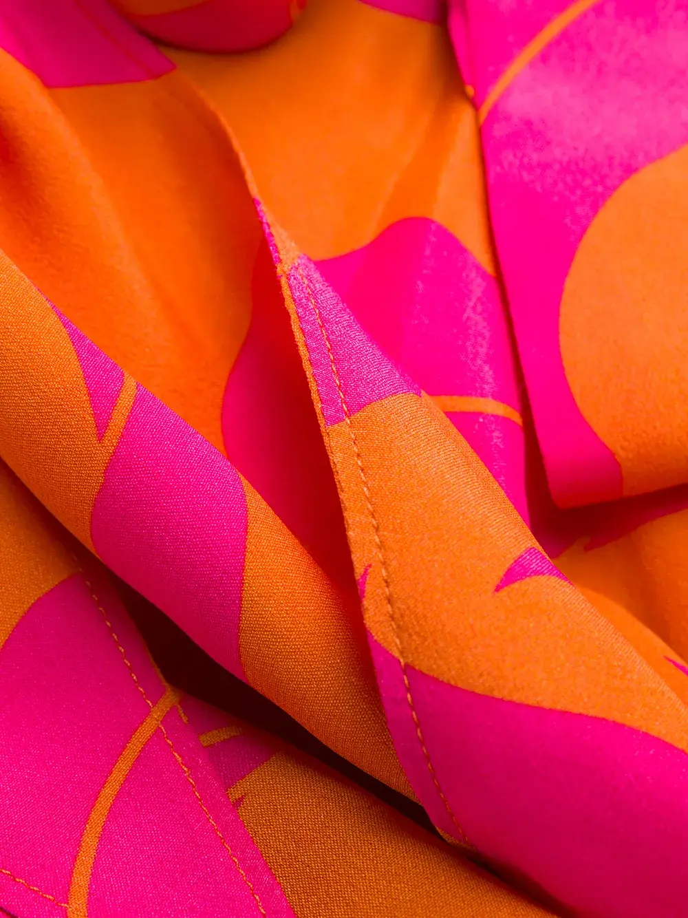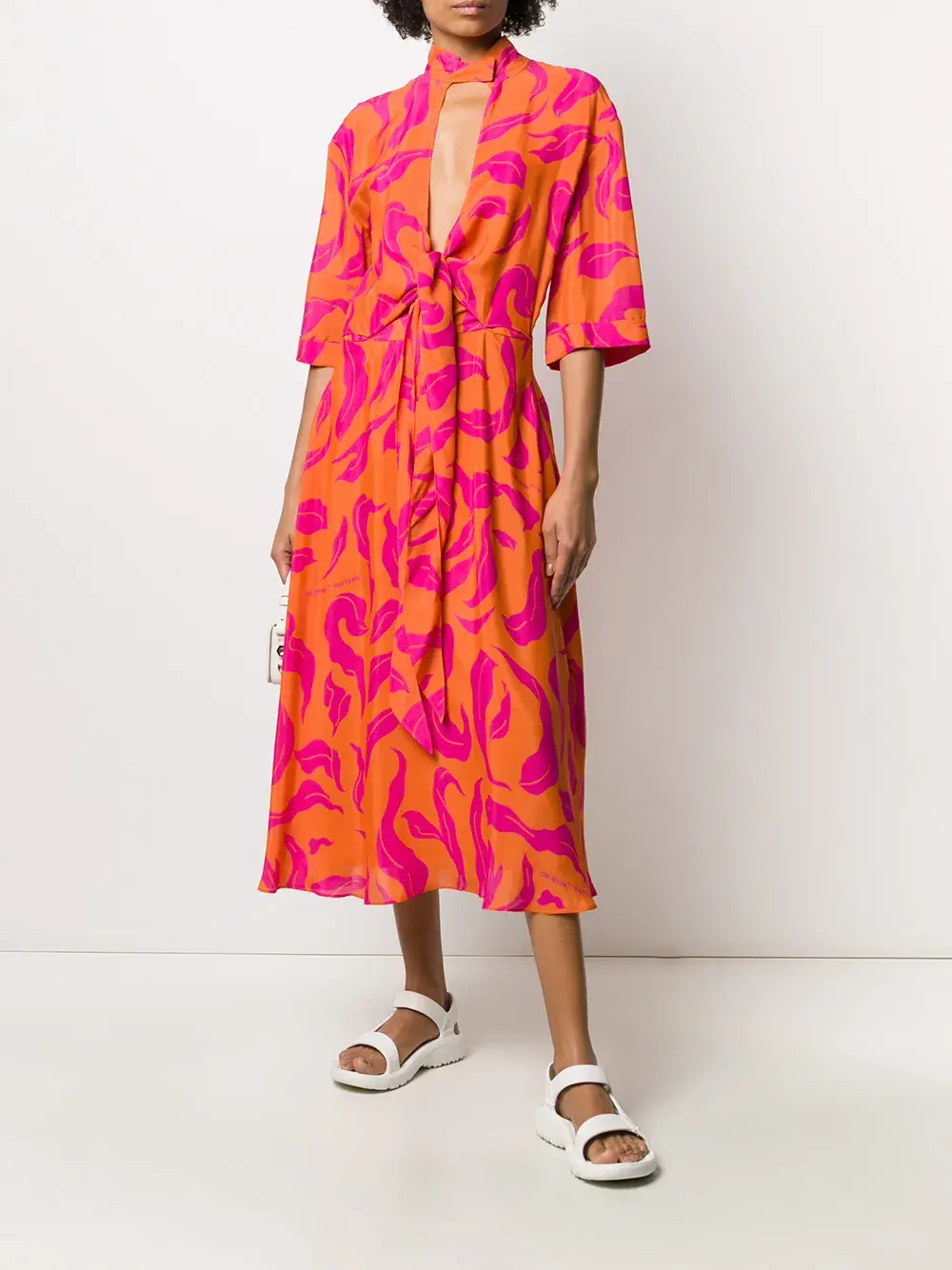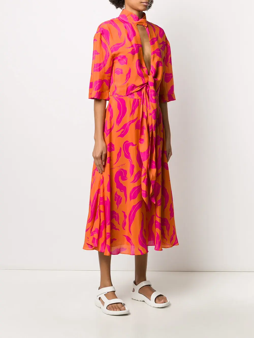 Молодежная культура является основным источником вдохновения для миланского бренда Off-White, а стритстайл в новом переосмыслении — его визитной карточкой. В новую коллекцию вошло платье оранжевого и розового цвета из смесового шелка с тропическим принтом от Off-White. Воротник-стойка, модель с глубоким вырезом, застежка-завязка, рукава по локоть и длина до середины голени.