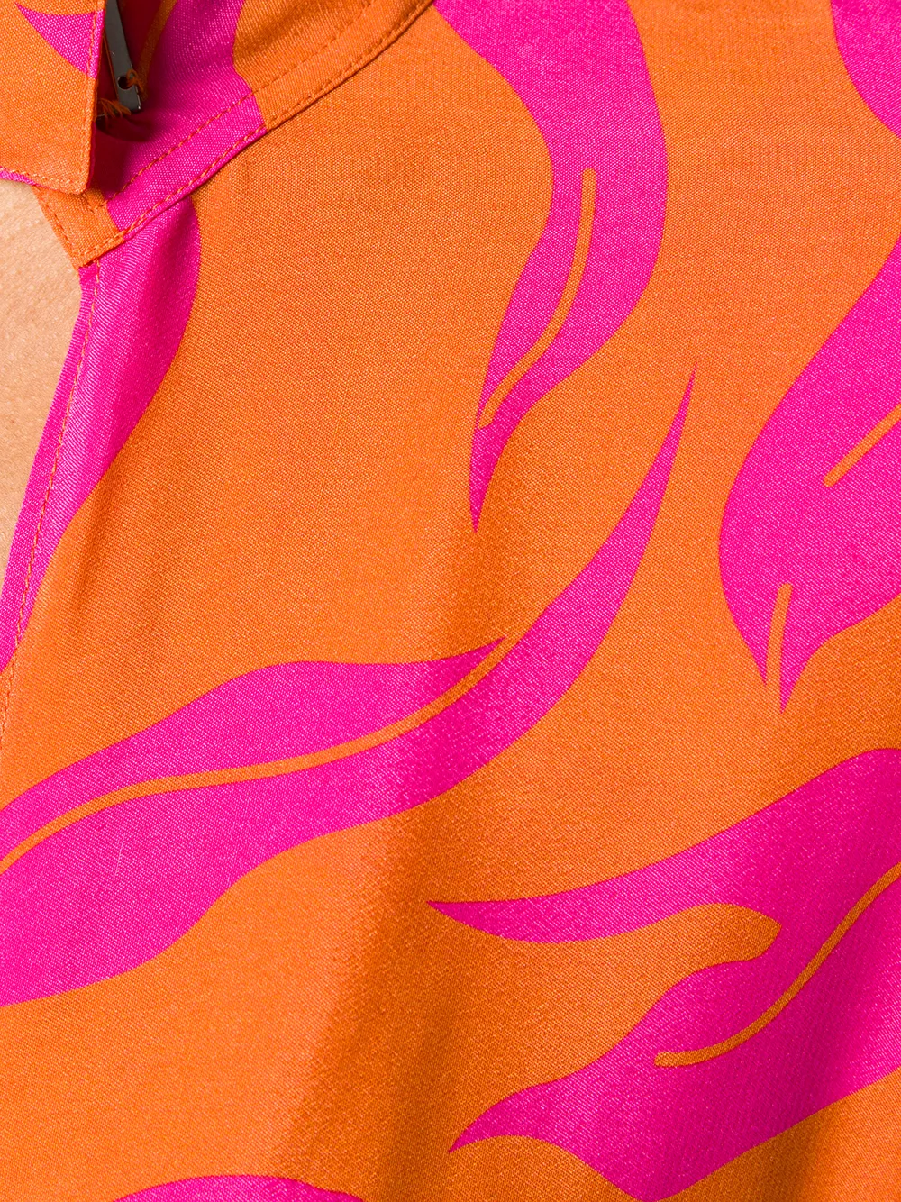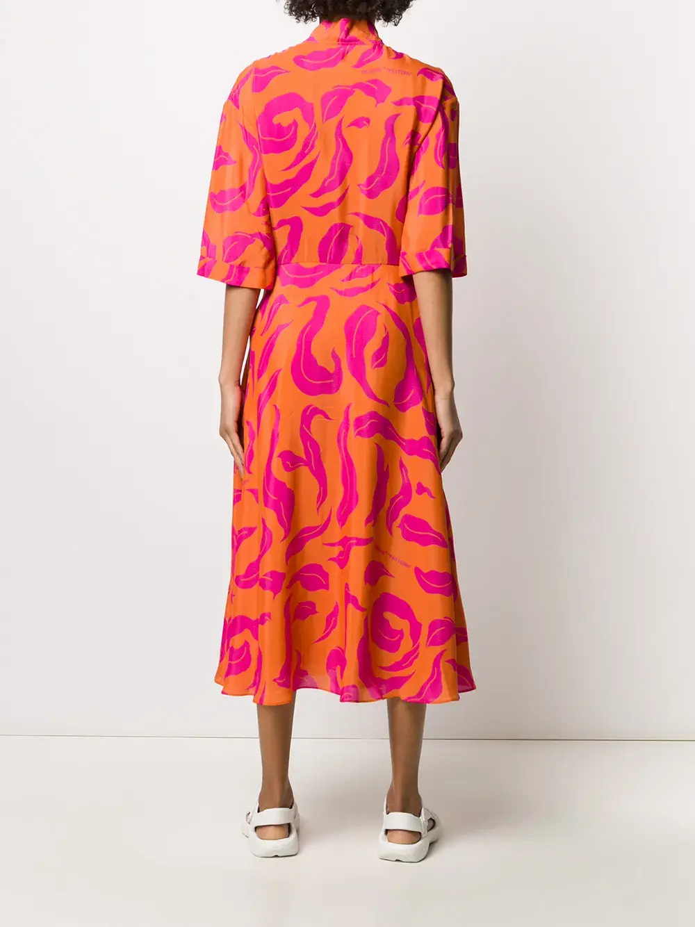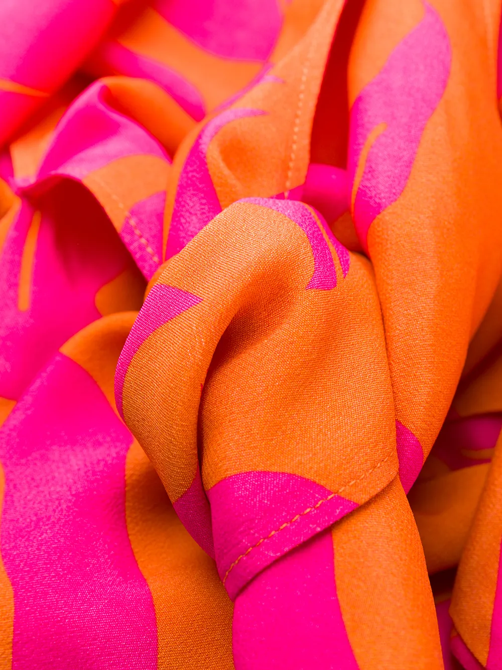 Молодежная культура является основным источником вдохновения для миланского бренда Off-White, а стритстайл в новом переосмыслении — его визитной карточкой. В новую коллекцию вошло платье оранжевого и розового цвета из смесового шелка с тропическим принтом от Off-White. Воротник-стойка, модель с глубоким вырезом, застежка-завязка, рукава по локоть и длина до середины голени.