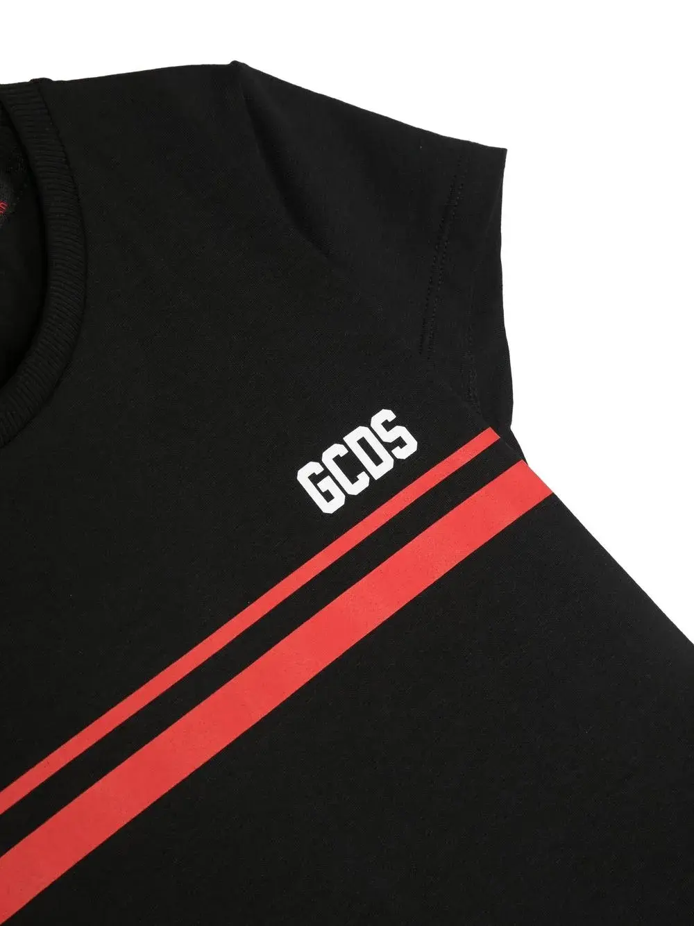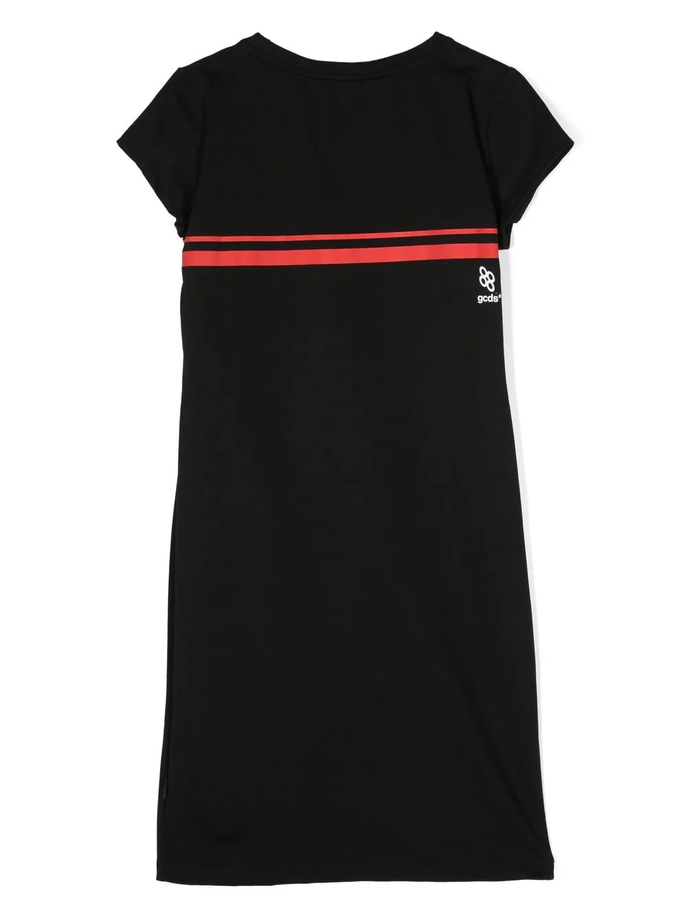 Черный, эластичный хлопок, полоски, принт с логотипом сзади, логотип спереди, прямой подол, круглый вырез, длина ниже колена и короткие рукава.