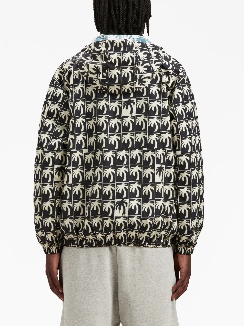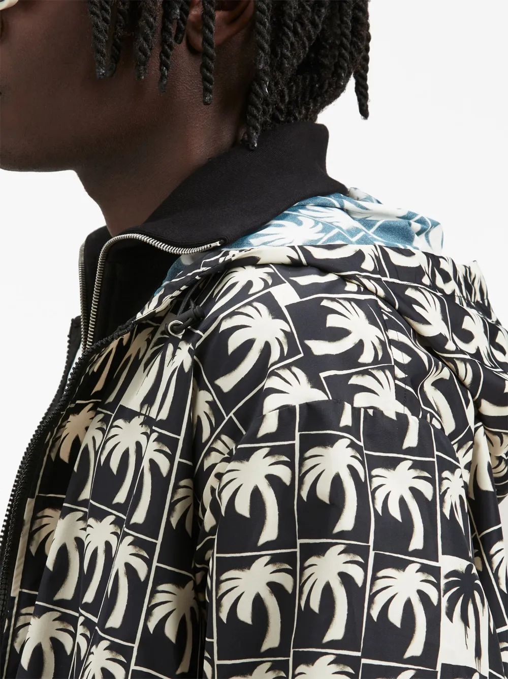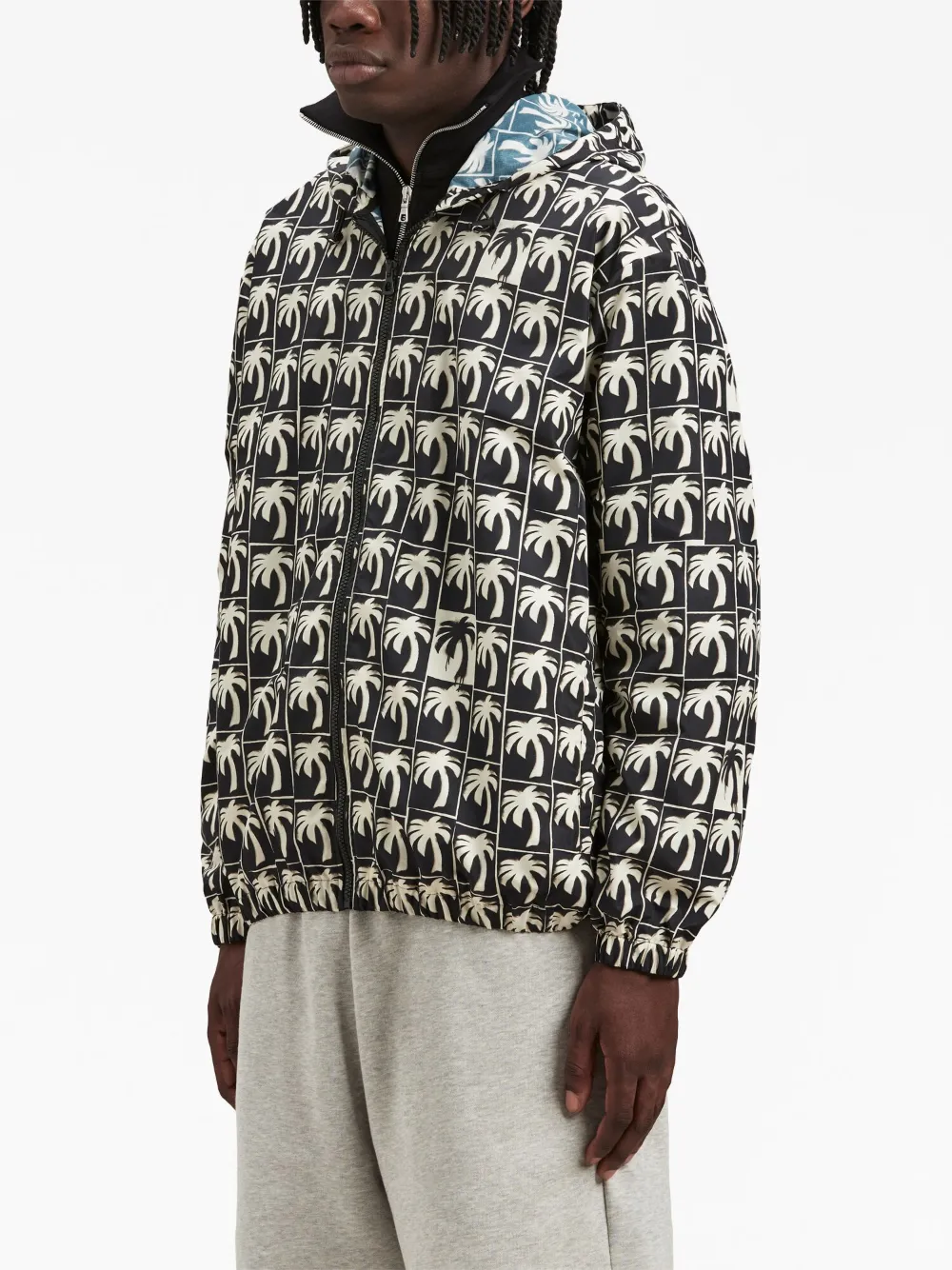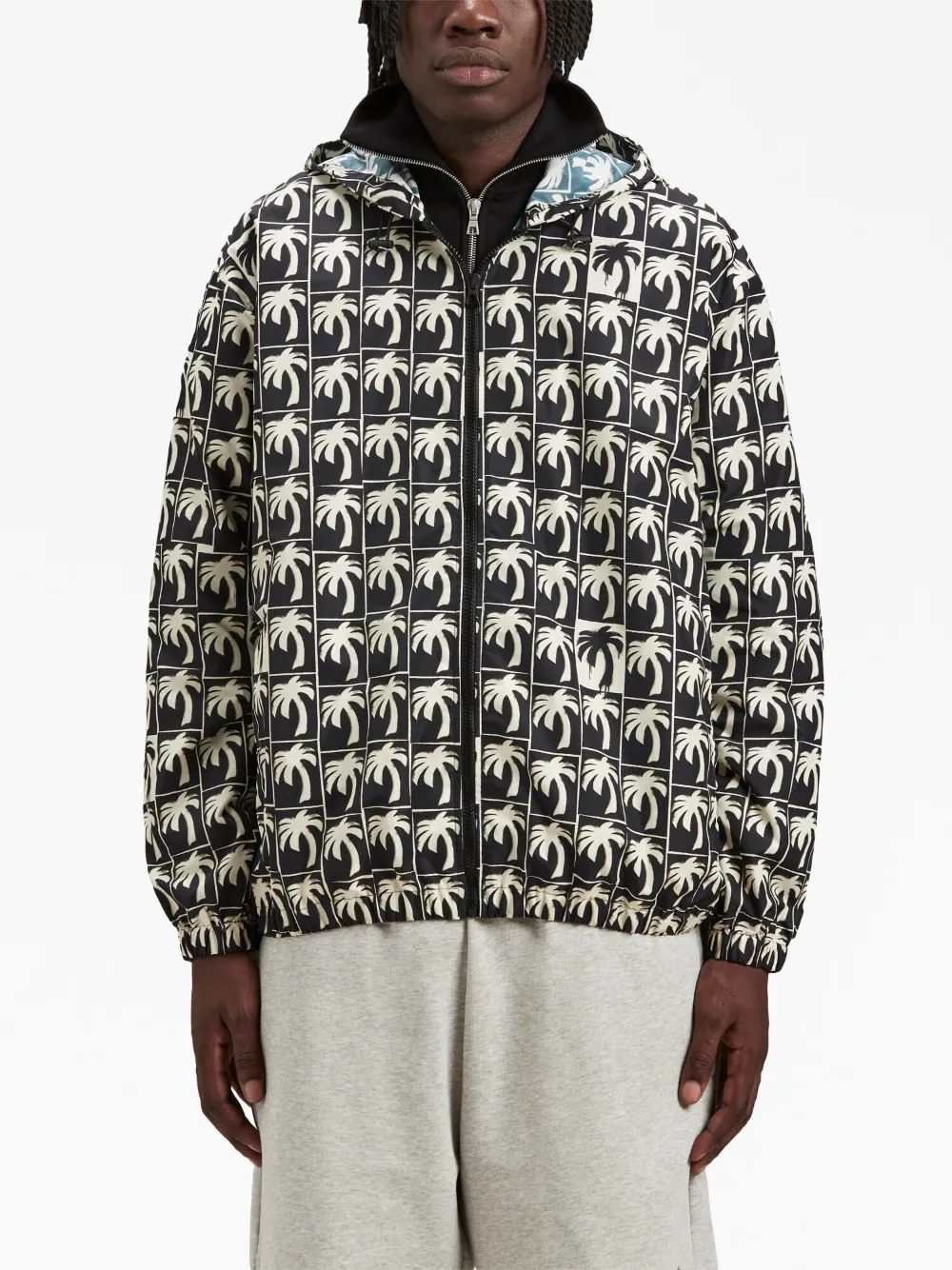 Черный, кремовый, принт с изображением пальм, застежка на молнии спереди, затягивающийся на шнурок капюшон, два кармана на молнии по бокам, длинные рукава, эластичный подол и эластичные манжеты.