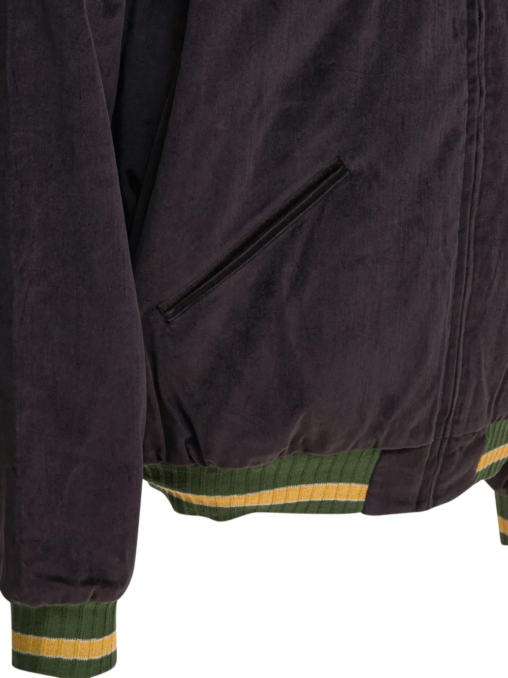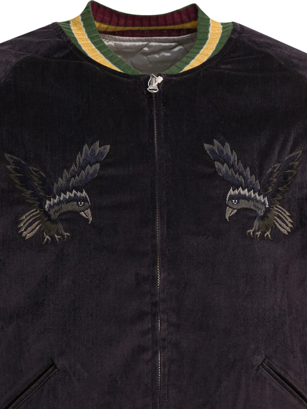 Темно-серая текстурированная отделка, вышитый орел, ребристые отделки, застежка-молния спереди, прорезные карманы.