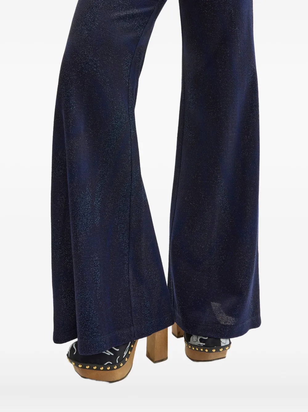 Темно-синие расклешенные брюки с блестящей отделкой и высокой талией