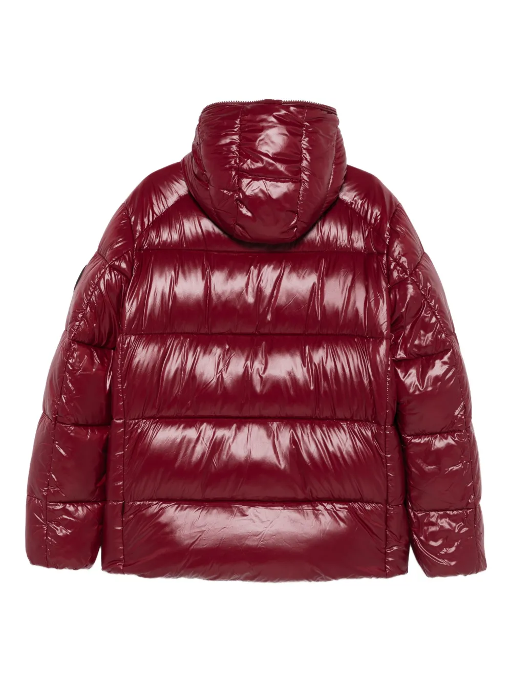 Стеганый жакет бордового цвета с блестящей оболочкой, застежкой-молнией, капюшоном и боковыми карманами-молниями.