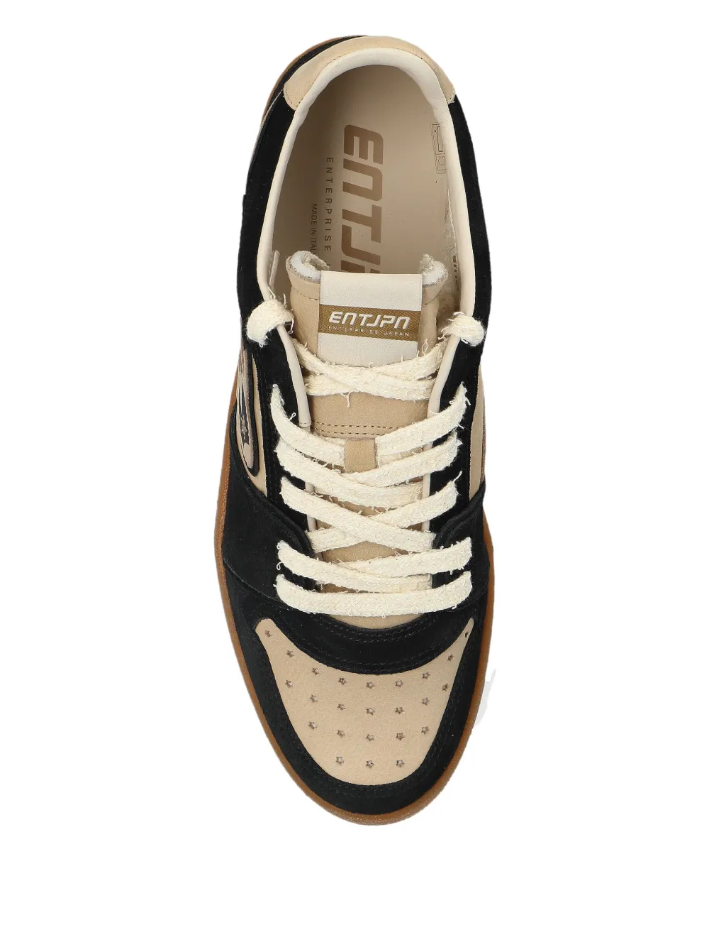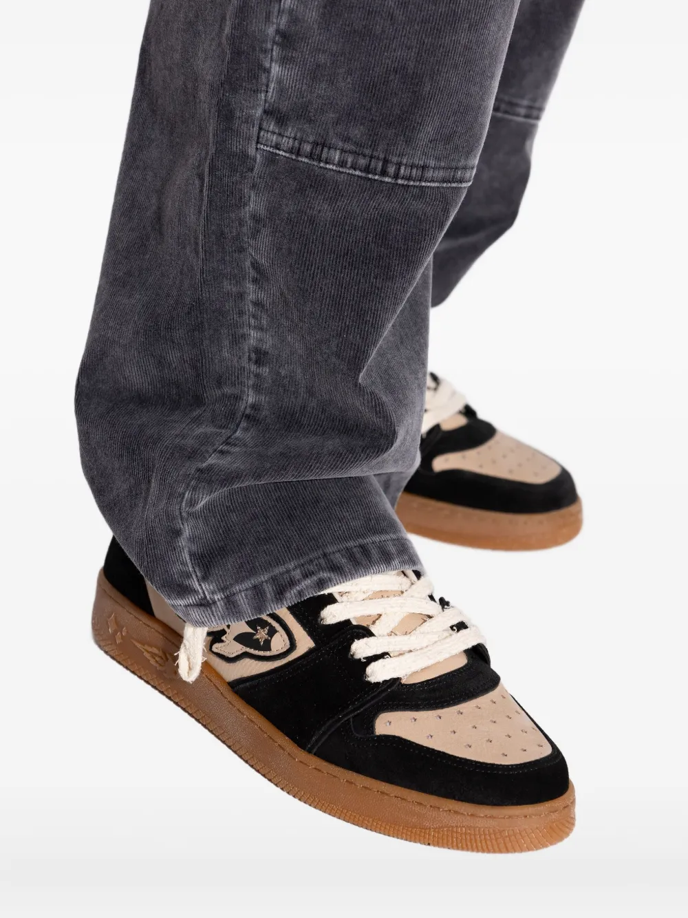 Черно-бежевые замшевые вставки, узор в виде пламени и звезд, резиновая подошва, шнуровка.