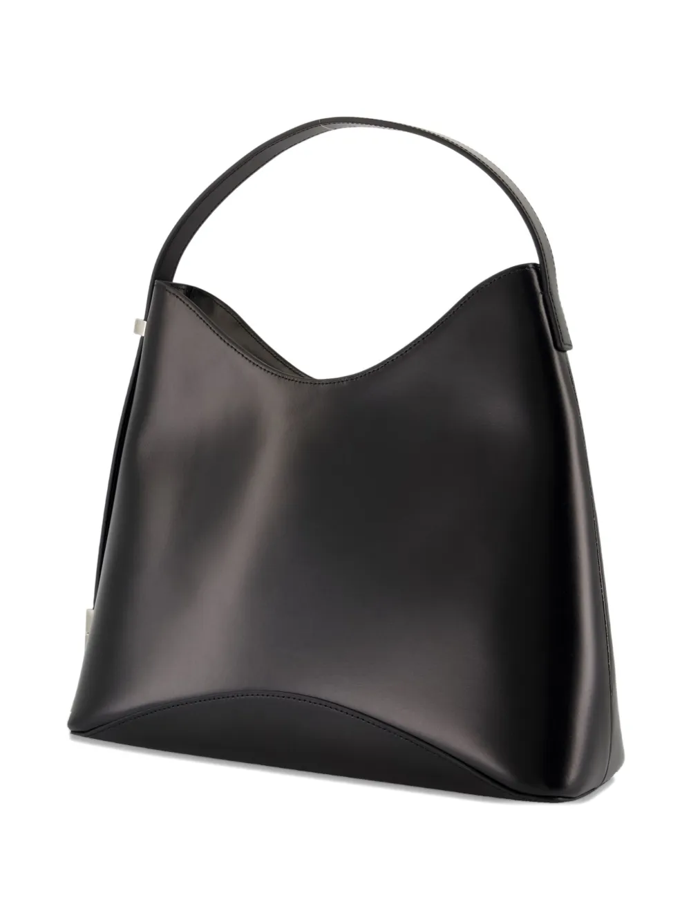 Черная гладкая телячья кожа, верхняя ручка, застежка-застежка изогнутого силуэта, одно отделение