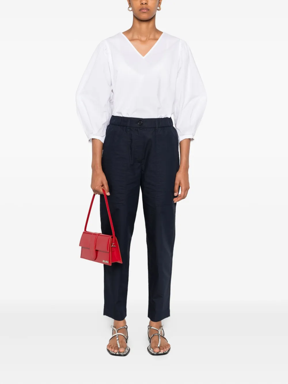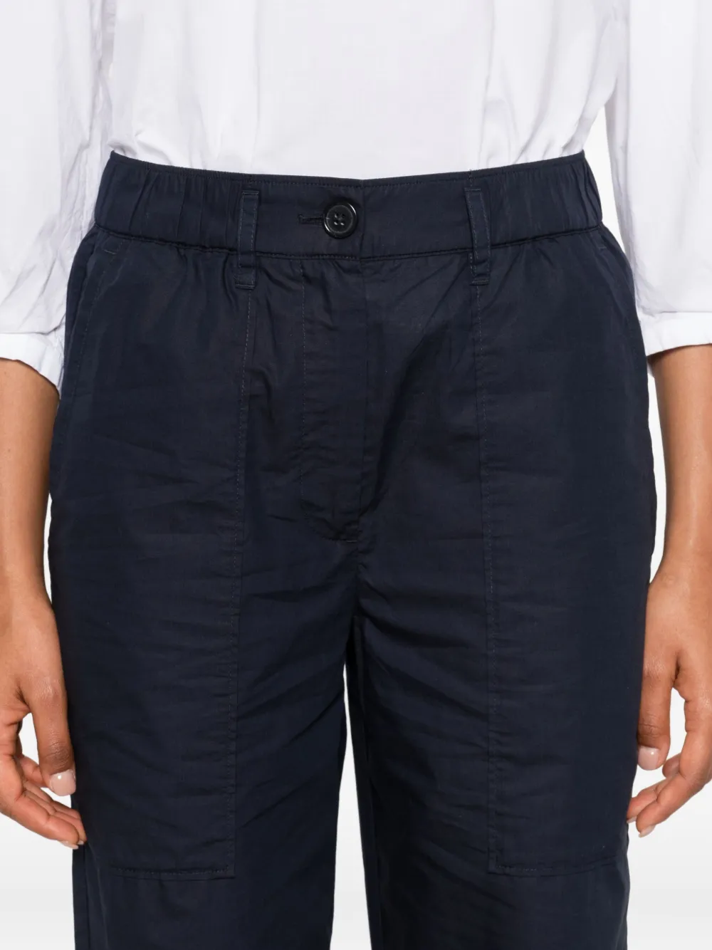 Темно-синий эластичный пояс, застежка на пуговицы, прорезные карманы