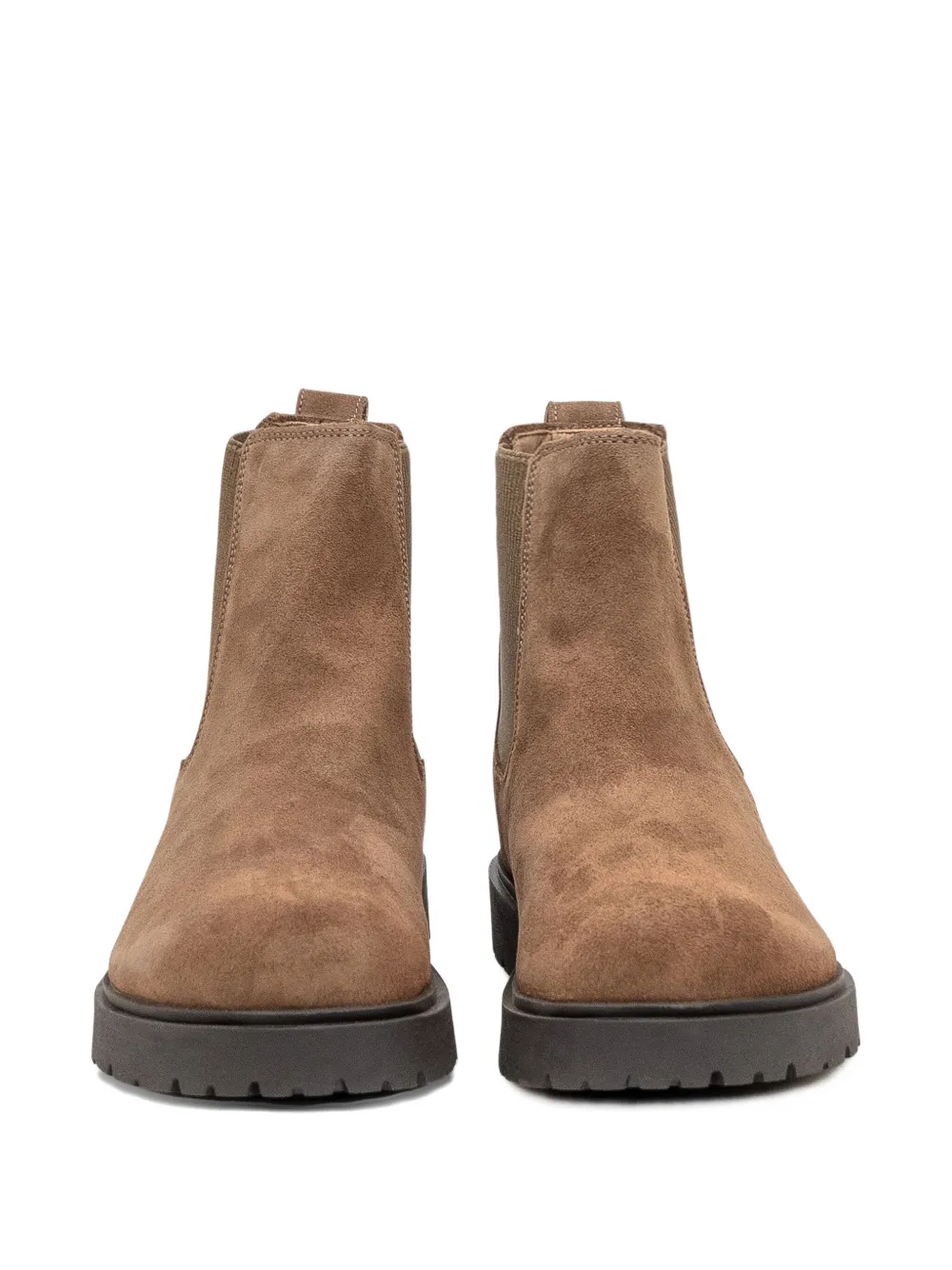Темно-коричневые замшевые эластичные боковые вставки, круглый носок, плоская подошва, язычок для подтягивания