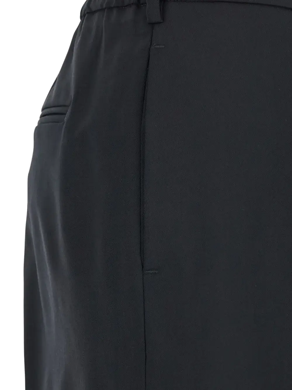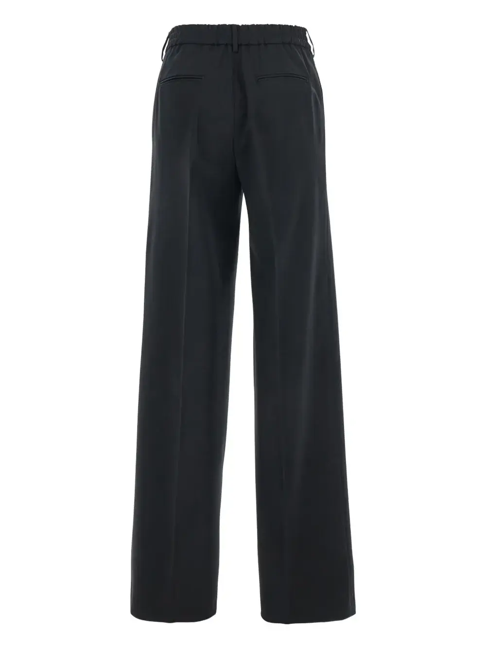 Черный полуэластичный пояс, широкие штанины, прямые карманы, складки спереди, потайная молния, гульфик