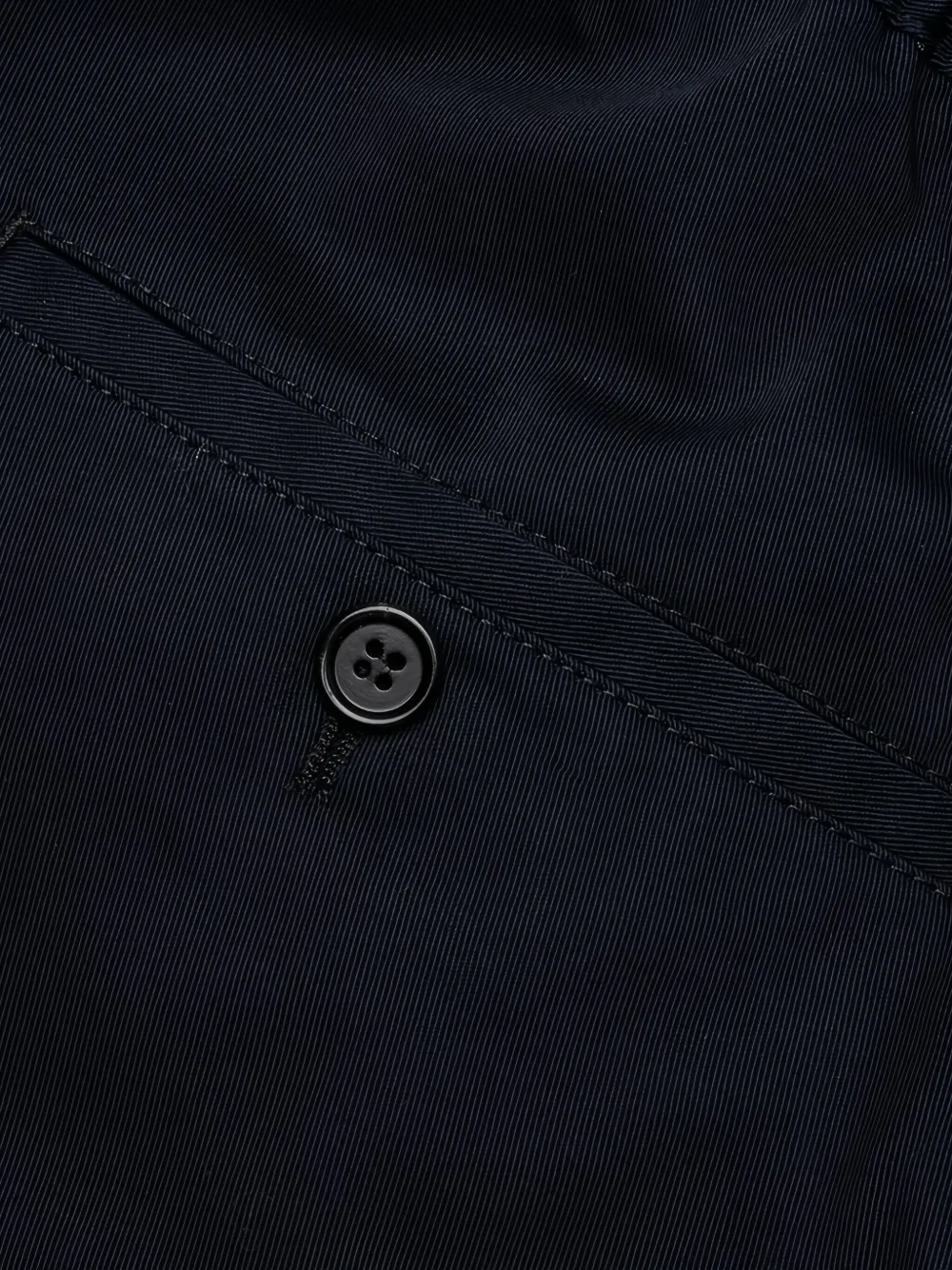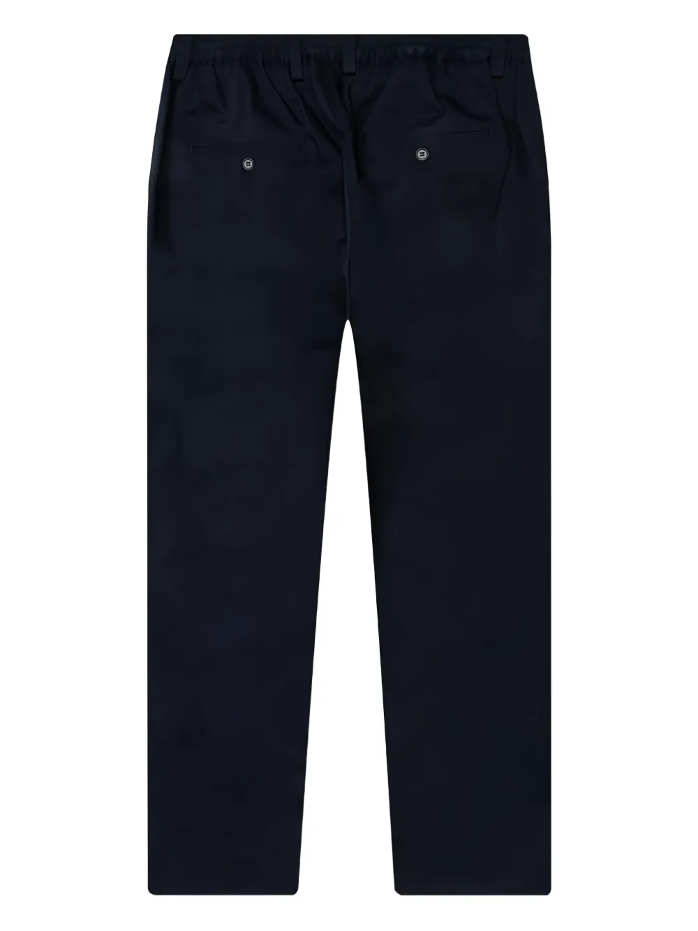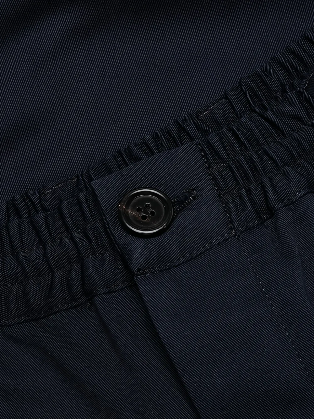 Эластичный пояс темно-синего цвета, застежка на пуговицы, прорезной карман, прямой крой