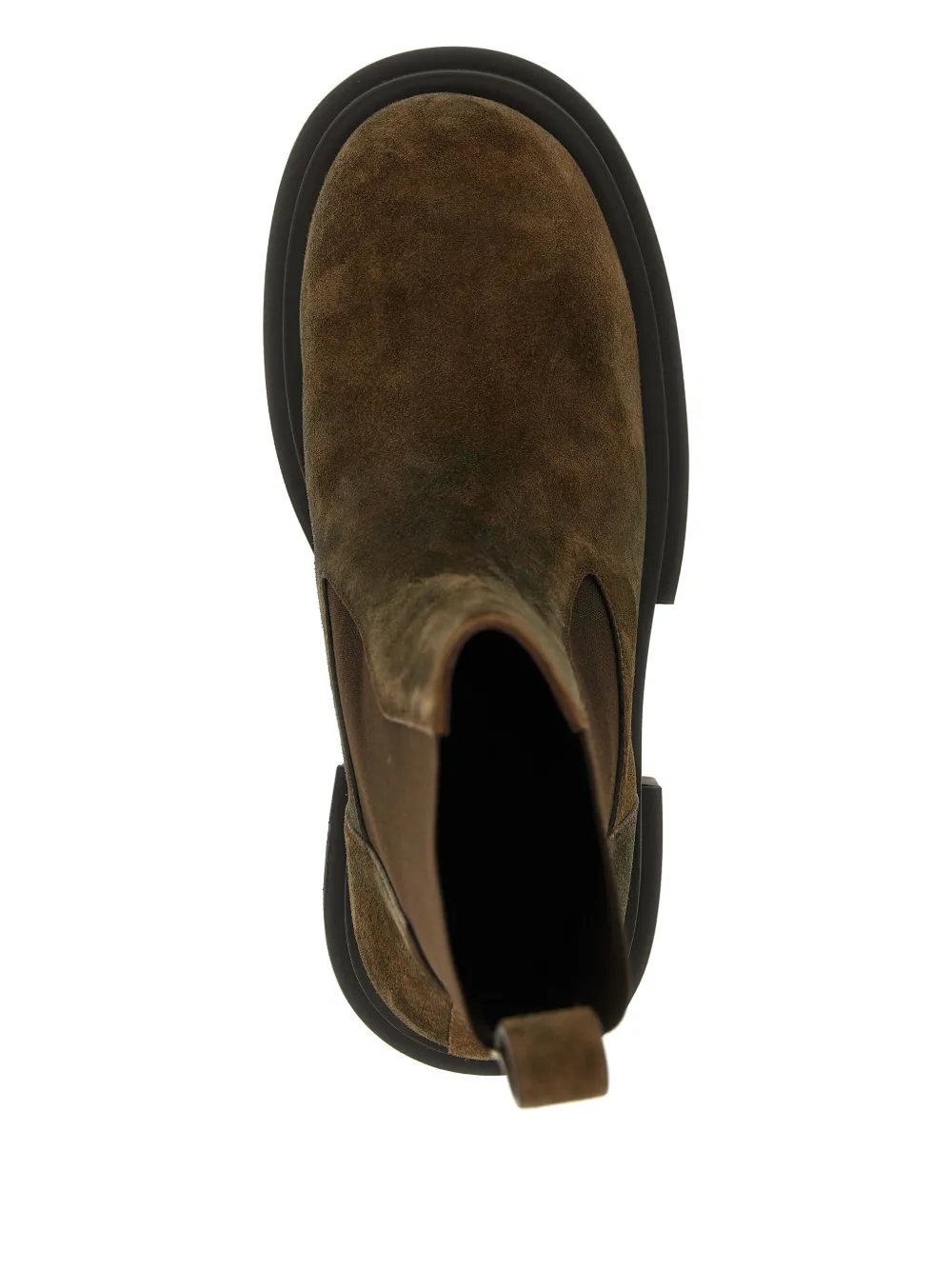Верх из коричневой замши, эластичная вставка на щиколотке, платформа, квадратный каблук, круглый носок.