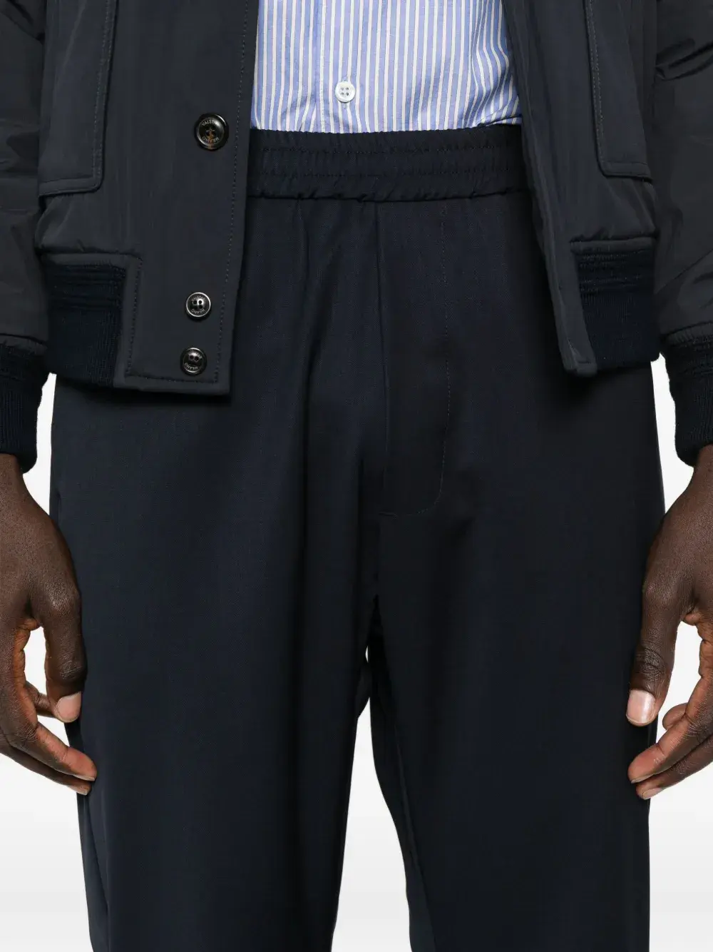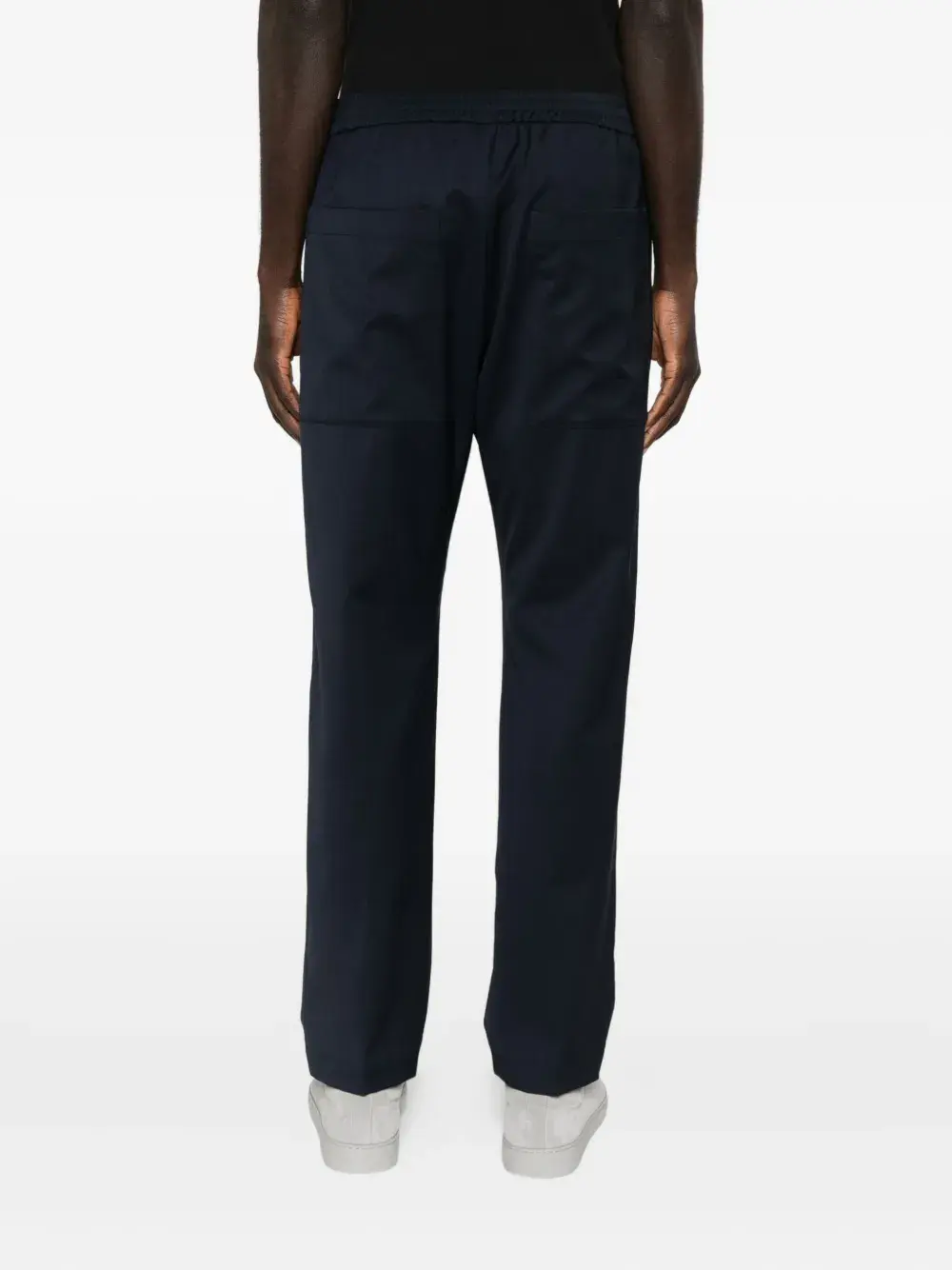 Эластичный пояс темно-синего цвета, потайная застежка, накладные карманы сзади.