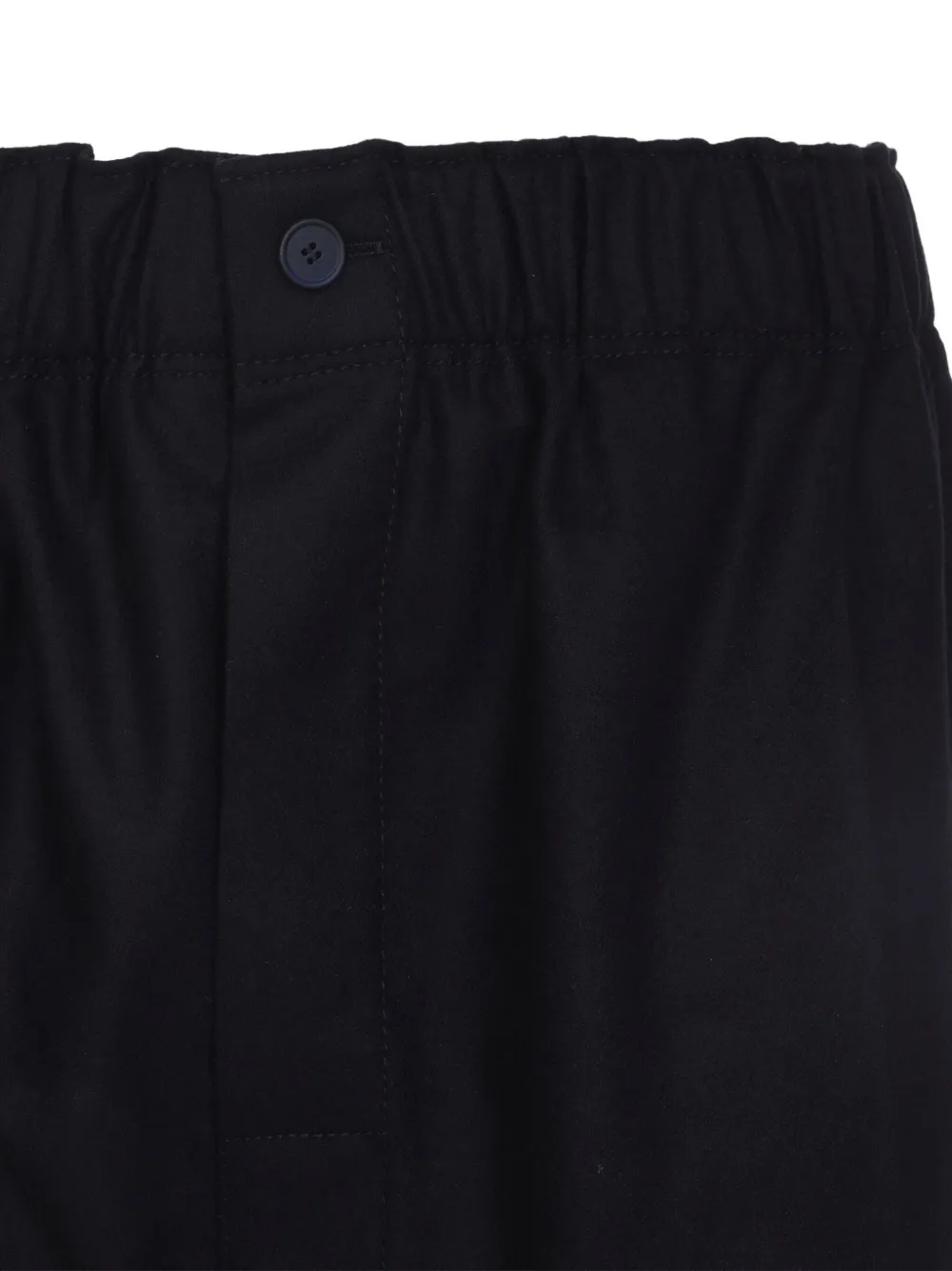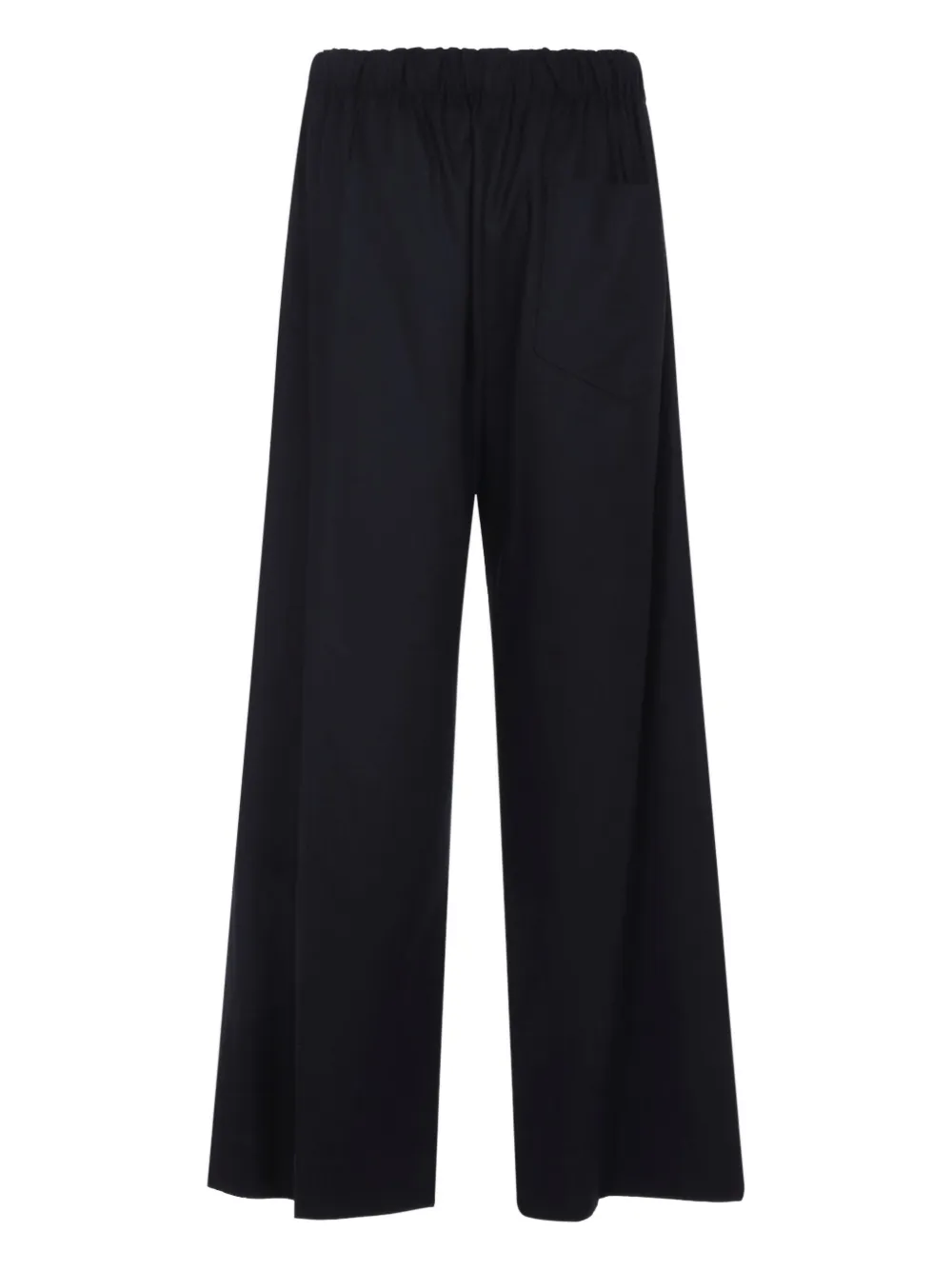 Эластичный пояс из шерсти темно-синего цвета, застежка на пуговицы, широкие штанины, прямой подол