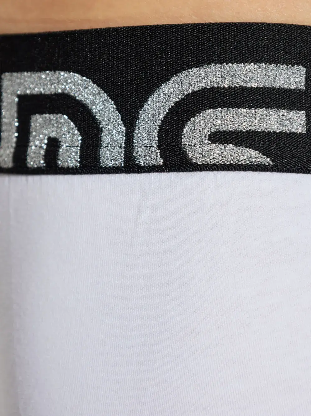 Белый черный пояс с серебристым блестящим логотипом, хлопковая смесь. Напоминаем, что эту вещь следует примерять поверх собственной одежды.