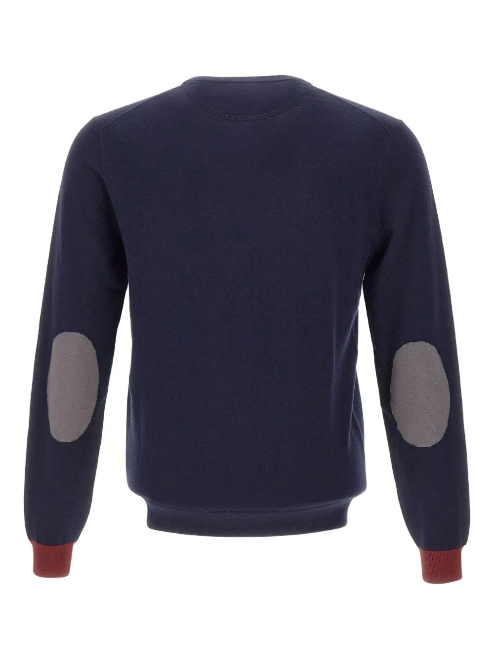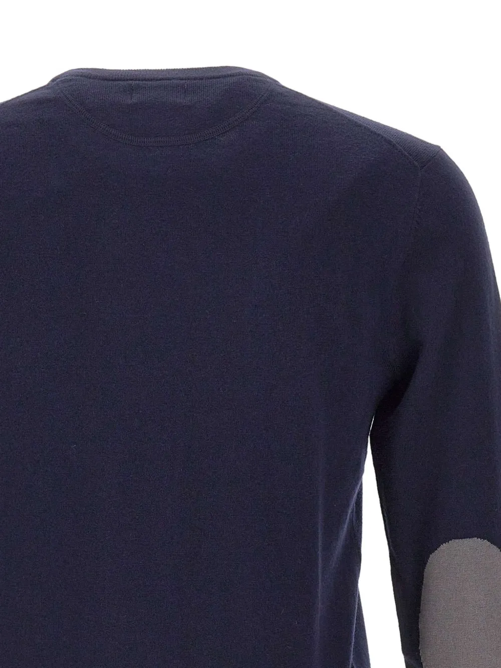 Контрастные синие заплатки на локтях, ребристые манжеты, круглый вырез горловины, небольшой логотип на груди.