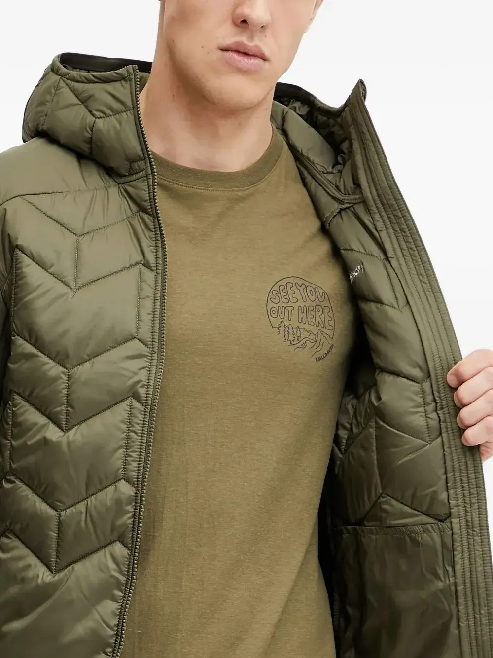 Оливково-зеленый шевронный стеганый капюшон с застежкой-молнией и длинными рукавами.