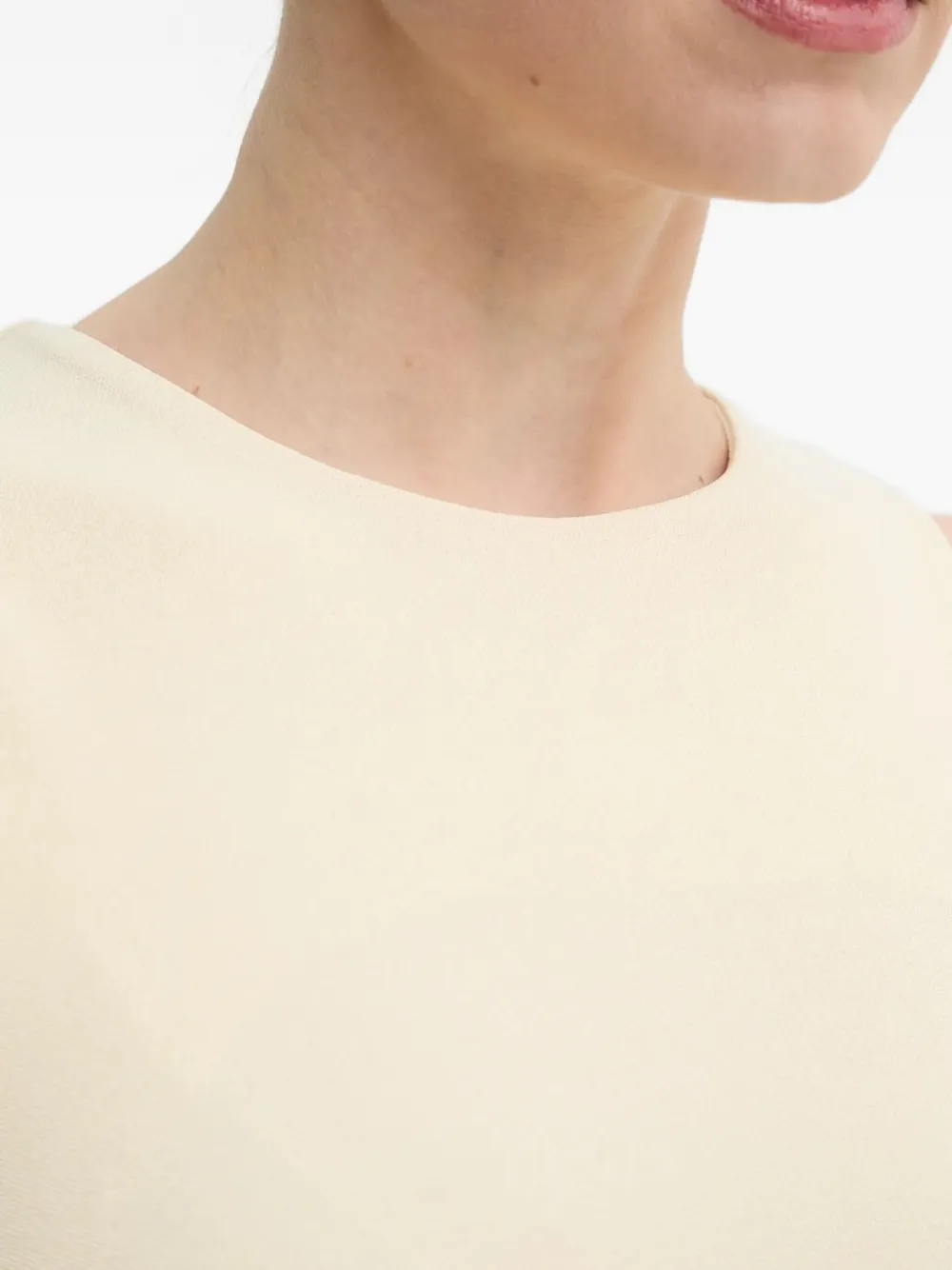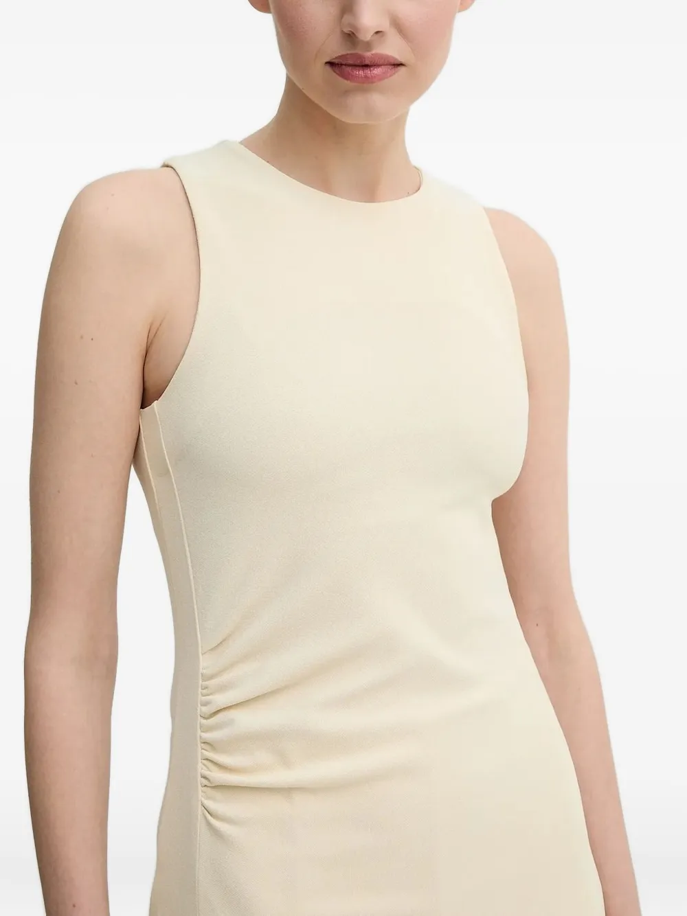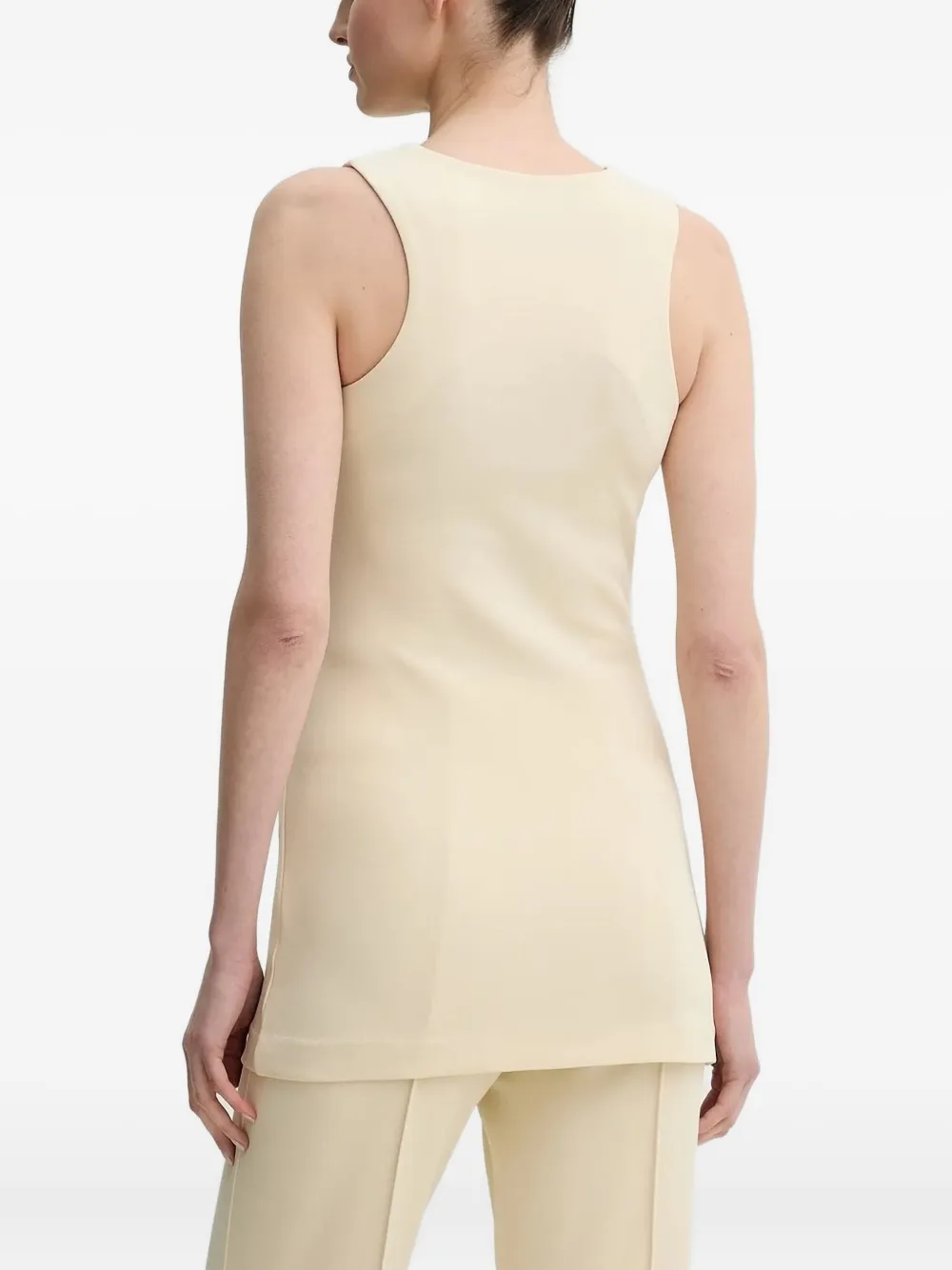 Бежевый, без рукавов, с круглым вырезом, боковыми швами, приталенным лифом и асимметричным подолом.