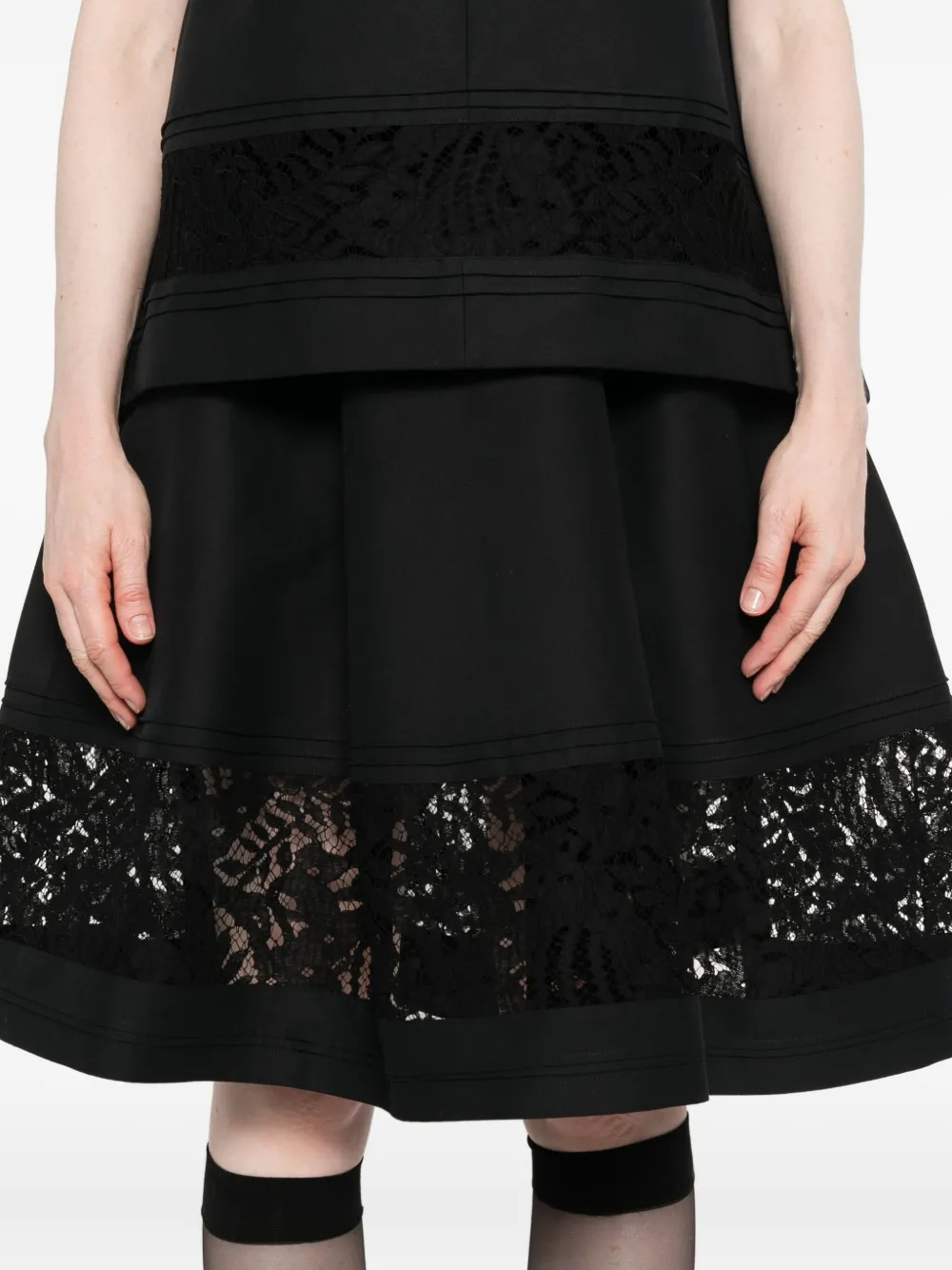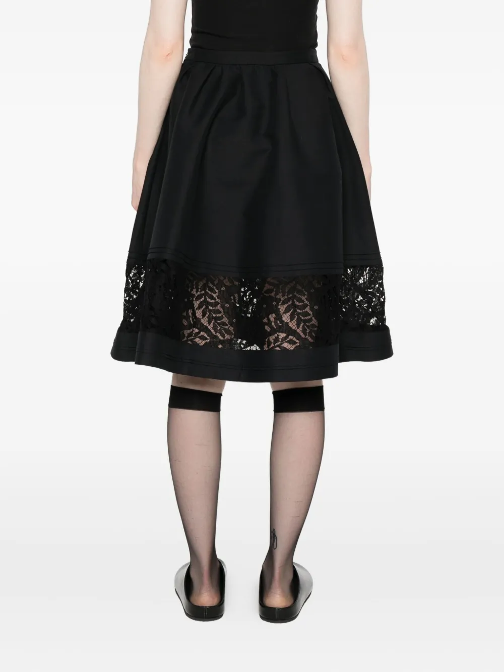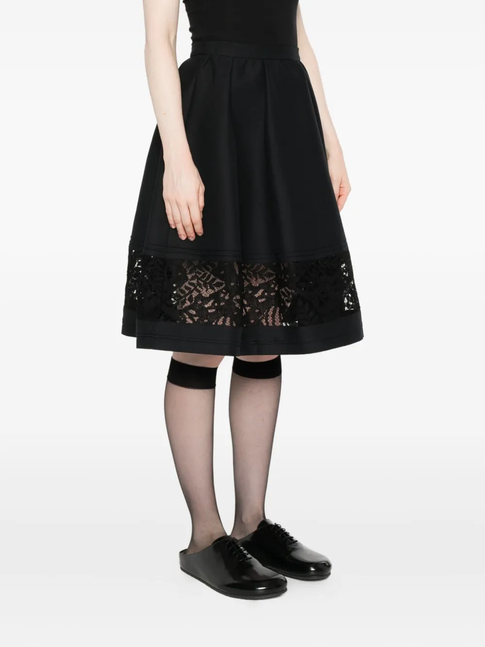Черная хлопковая ткань, расклешенный фасон, эластичный пояс, кружевная вставка, фестончатый кружевной край