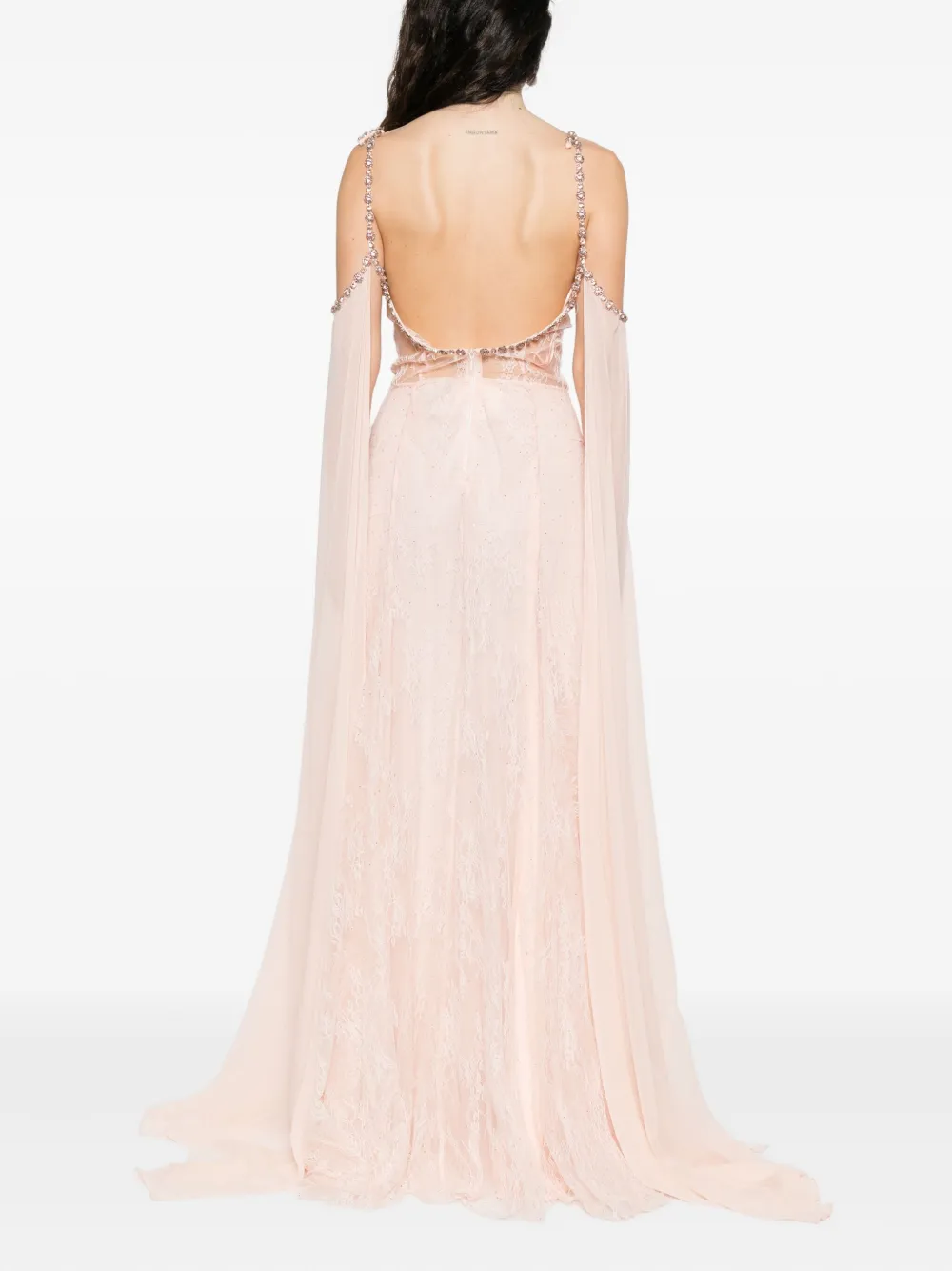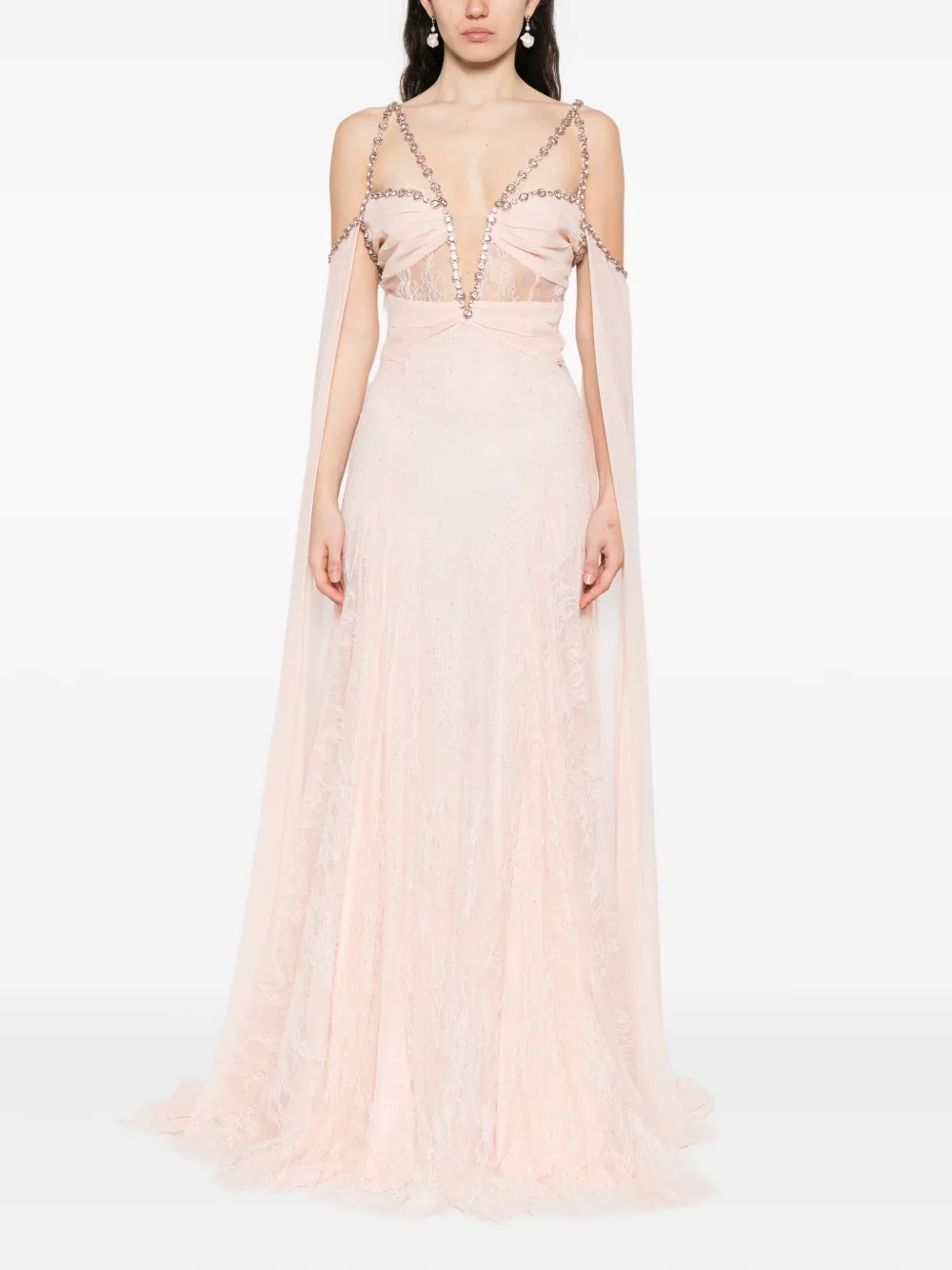 Розовая кружевная панель, декорированная бретелька, V-образный вырез, длинные рукава, прозрачная накладка, застежка-молния.