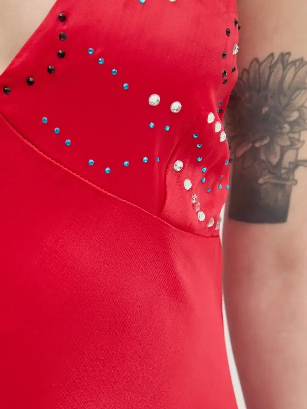 Тонкие бретельки, V-образный вырез, украшение из красных кристаллов