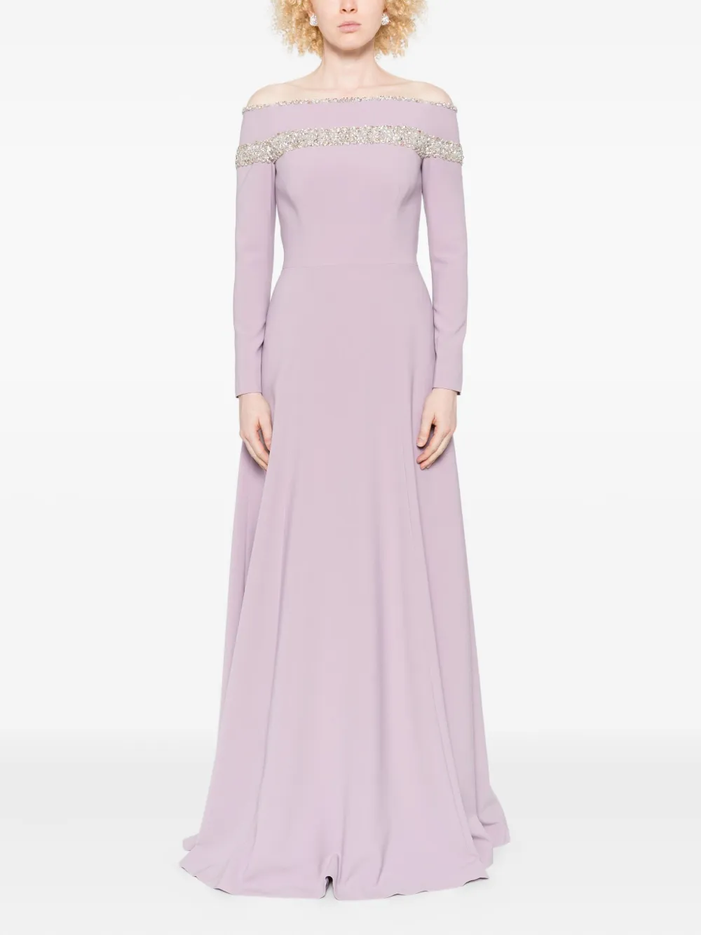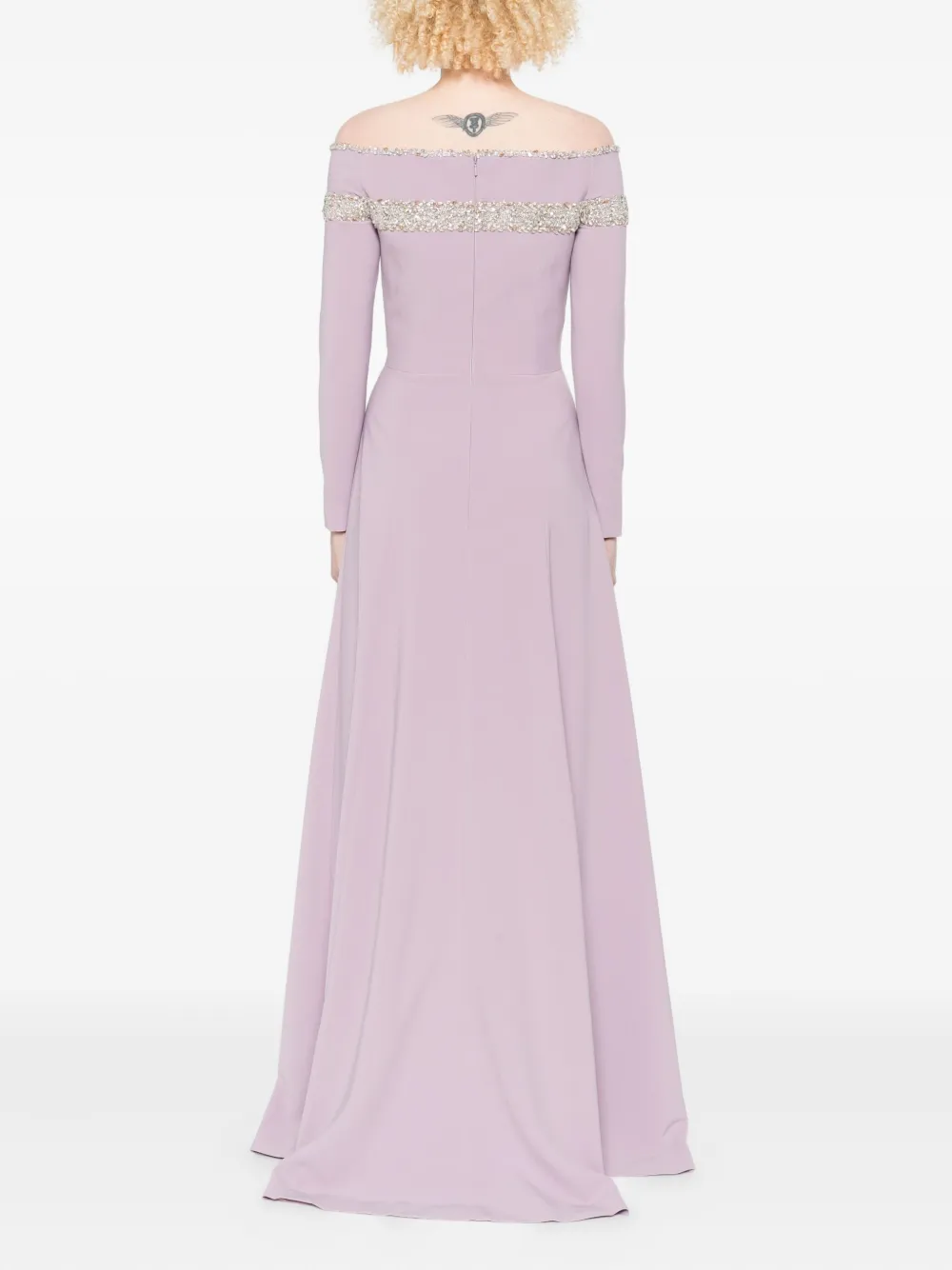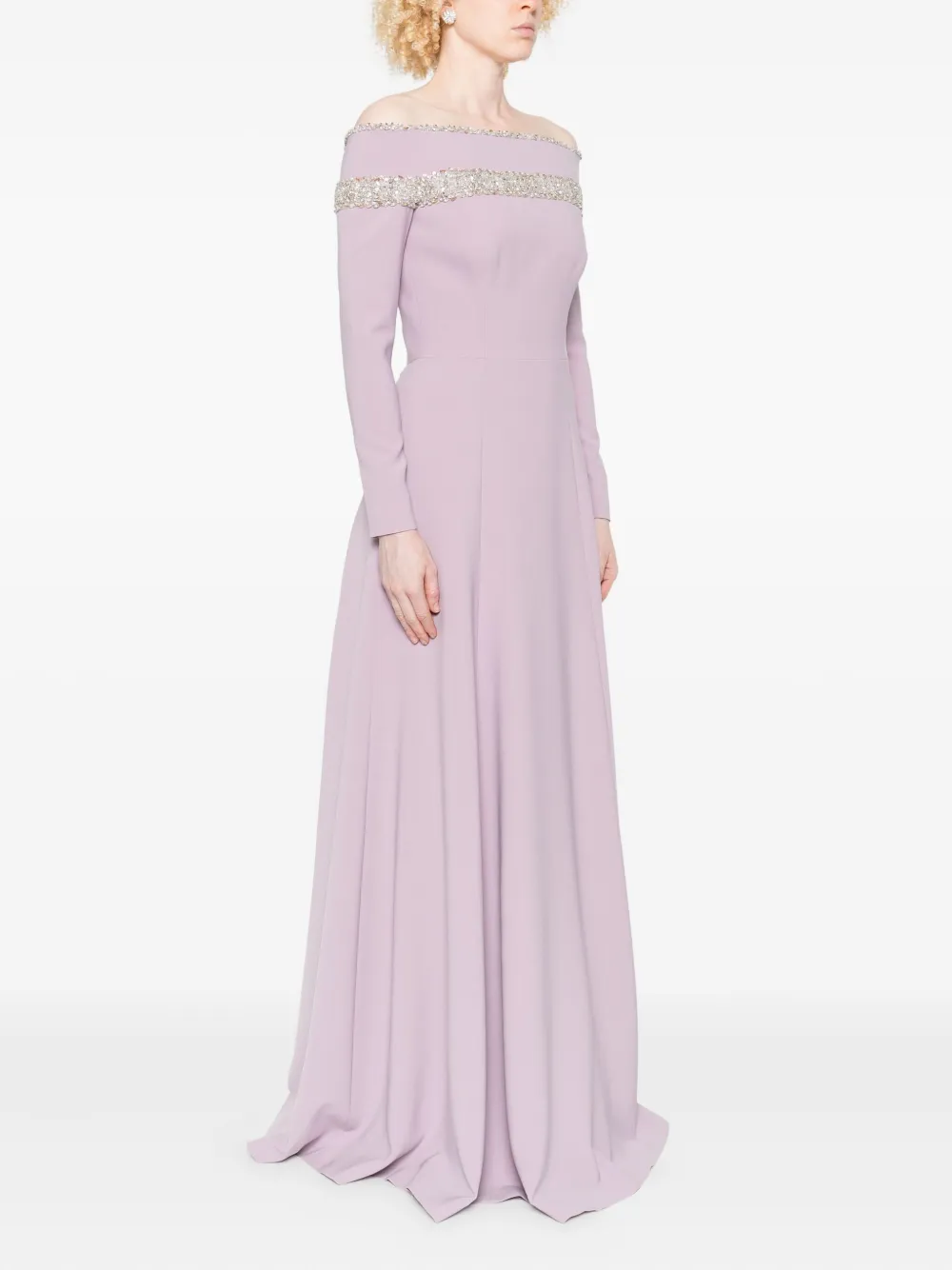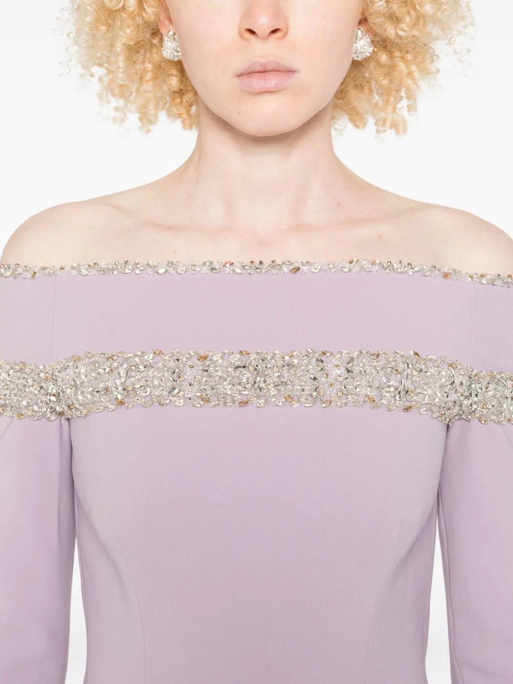 Юбка А-силуэта цвета лаванды с открытыми плечами, украшенная кристаллами.