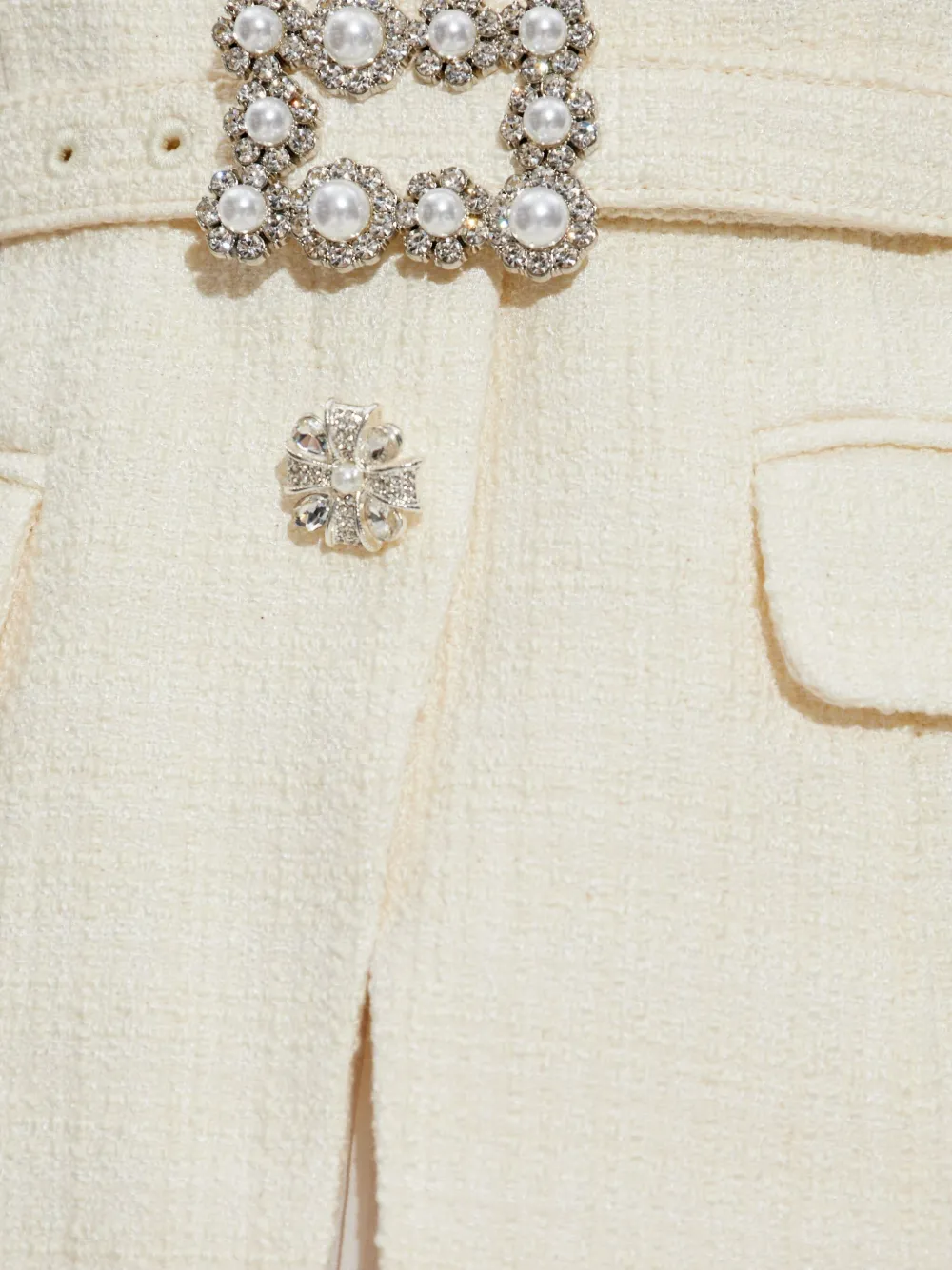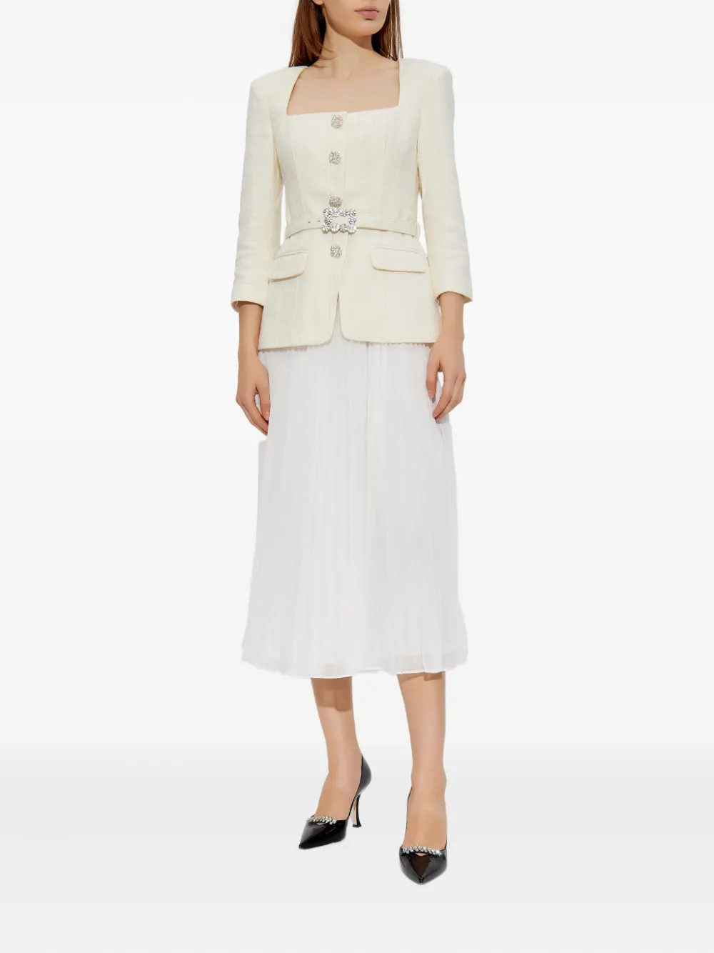 Бело-кремовый пояс с кристаллами, плиссированная юбка, застежка на пуговицы, рукава три четверти, квадратный вырез.