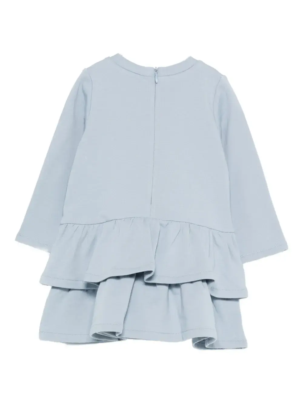 Пыльно-голубой, многослойные оборки, длинные рукава, круглый вырез сзади, застежка-молния