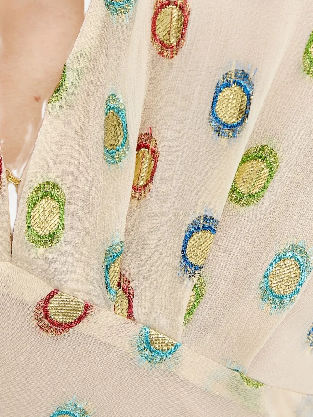 Кремовый круг с V-образным вырезом и короткими рукавами.