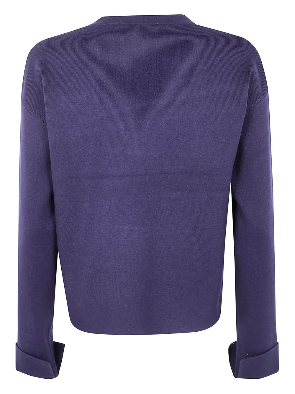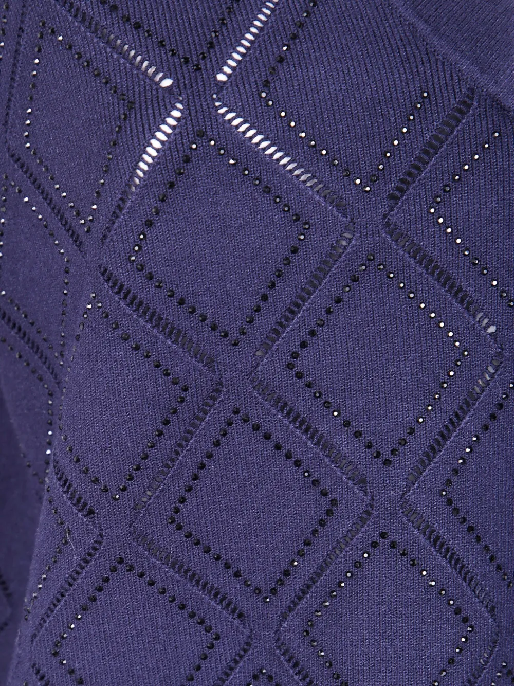 Темно-фиолетовый узор в виде ромбов, декорированный деталями, V-образный вырез, длинные рукава, ребристые манжеты.