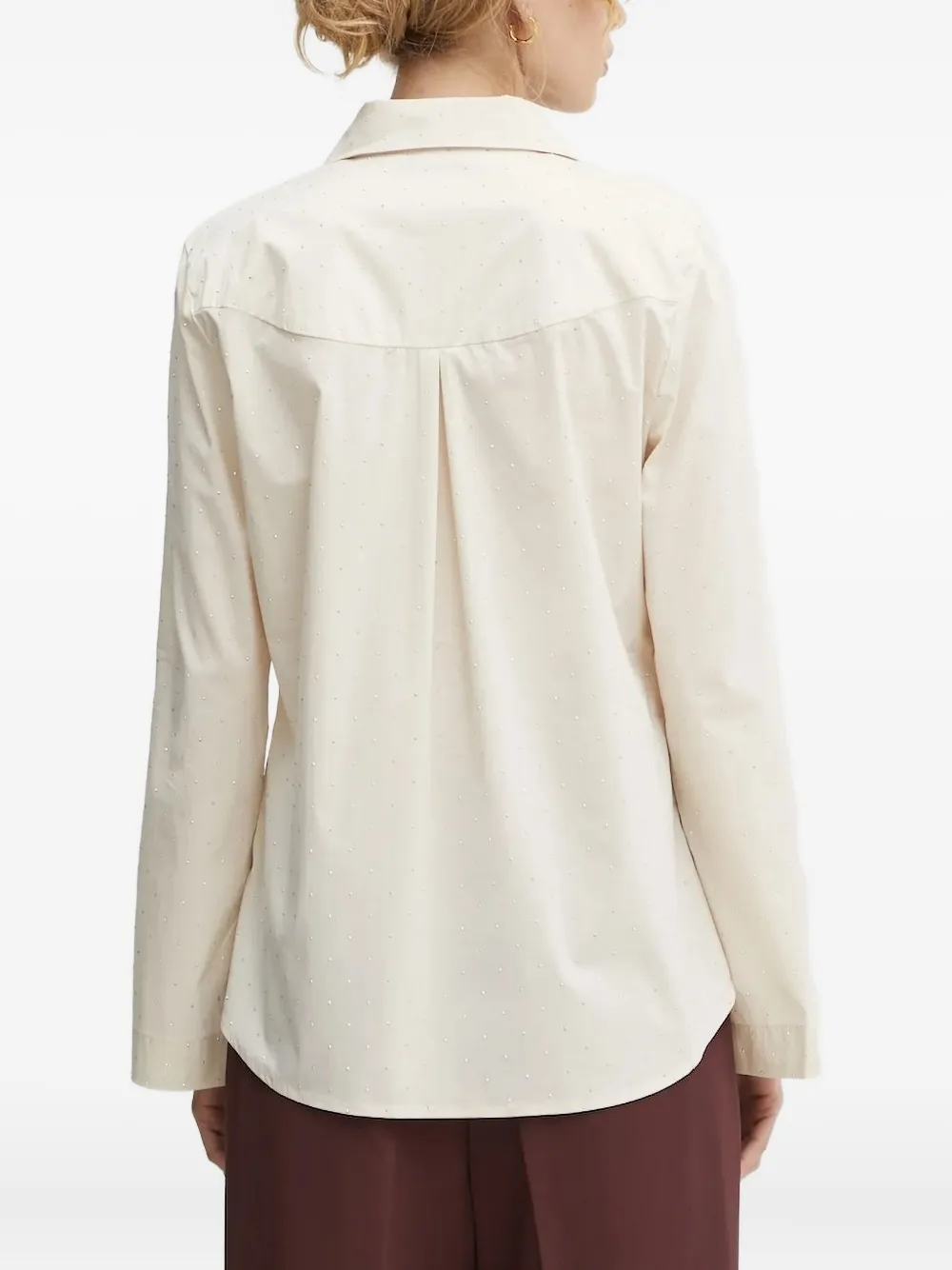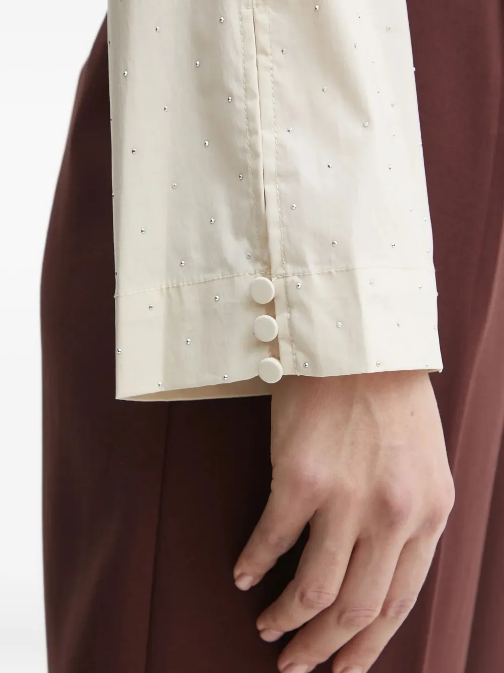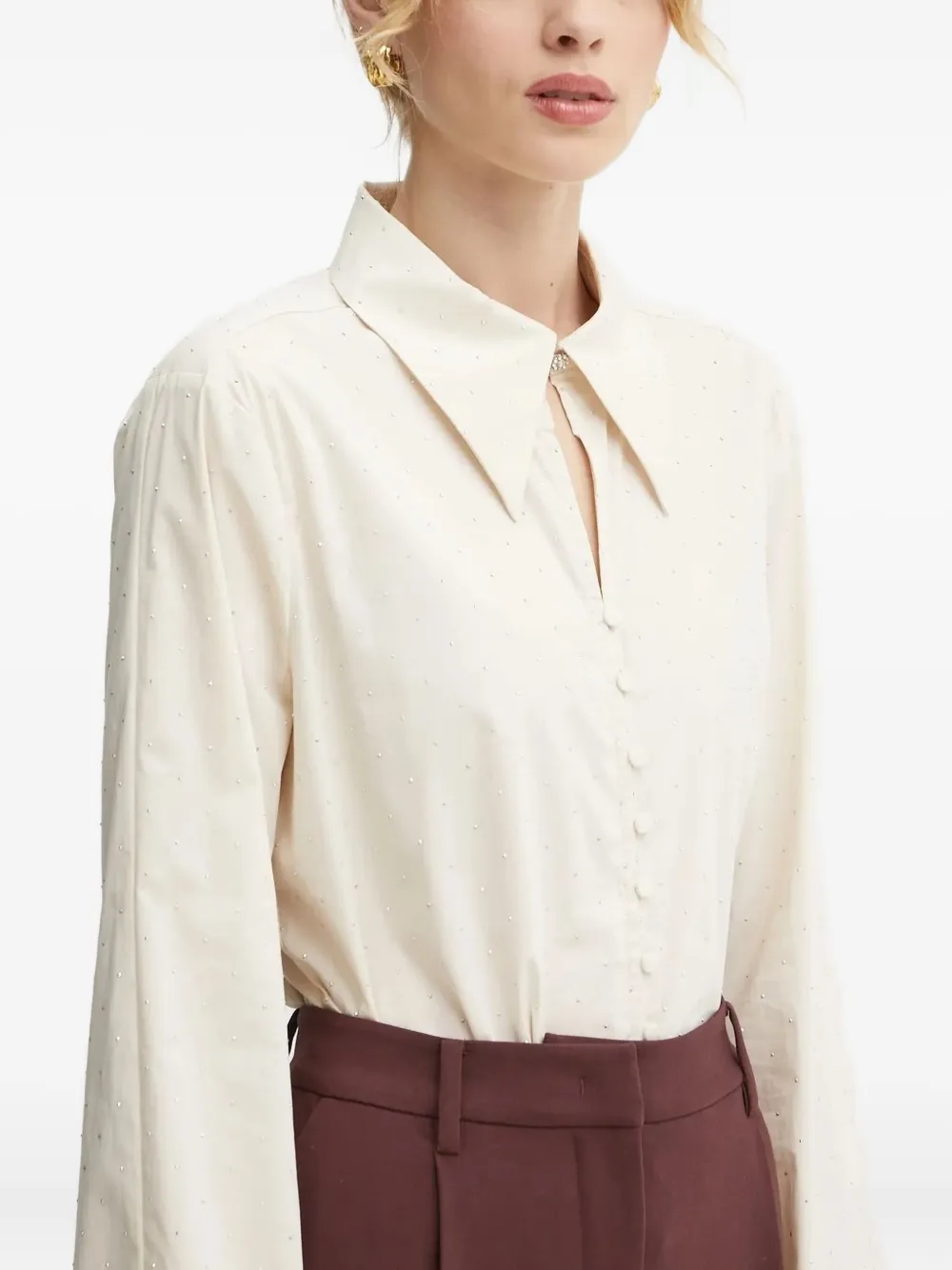 Украшение из белых кристаллов, заостренный воротник, застежка на пуговицы, длинные рукава, широкие манжеты.