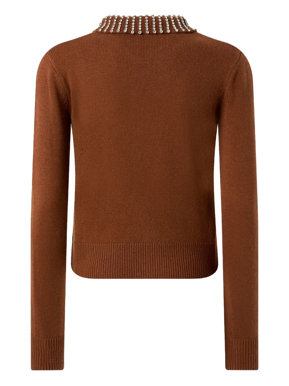 Коричневый воротник, украшенный кристаллами, ребристый подол и манжеты, длинные рукава.