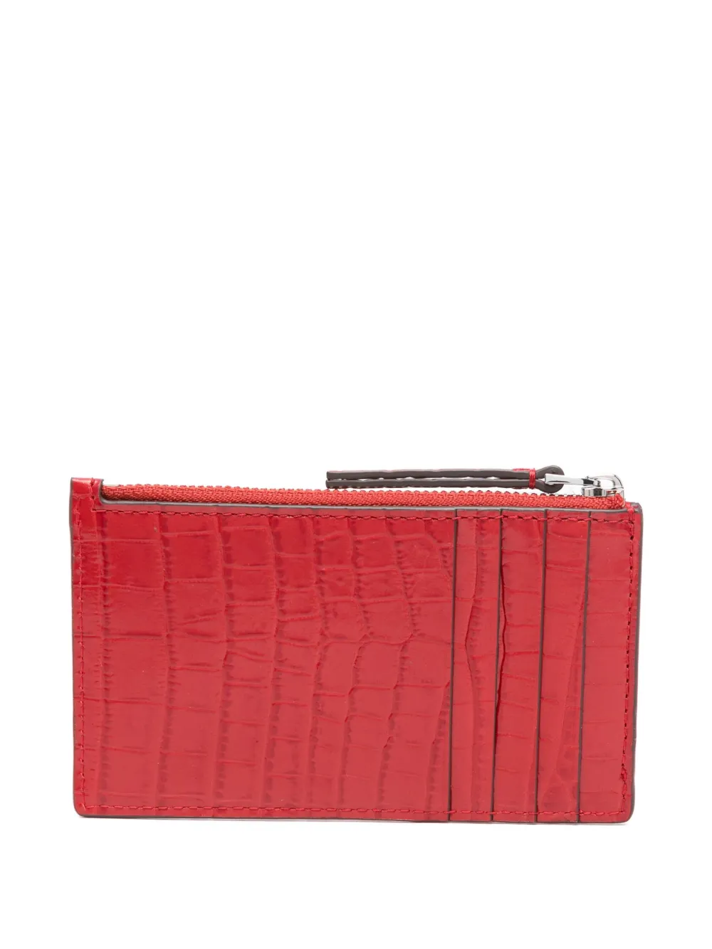 Красная застежка-молния с тиснением под крокодила, несколько отделений для карт, кожаная пластинка с логотипом