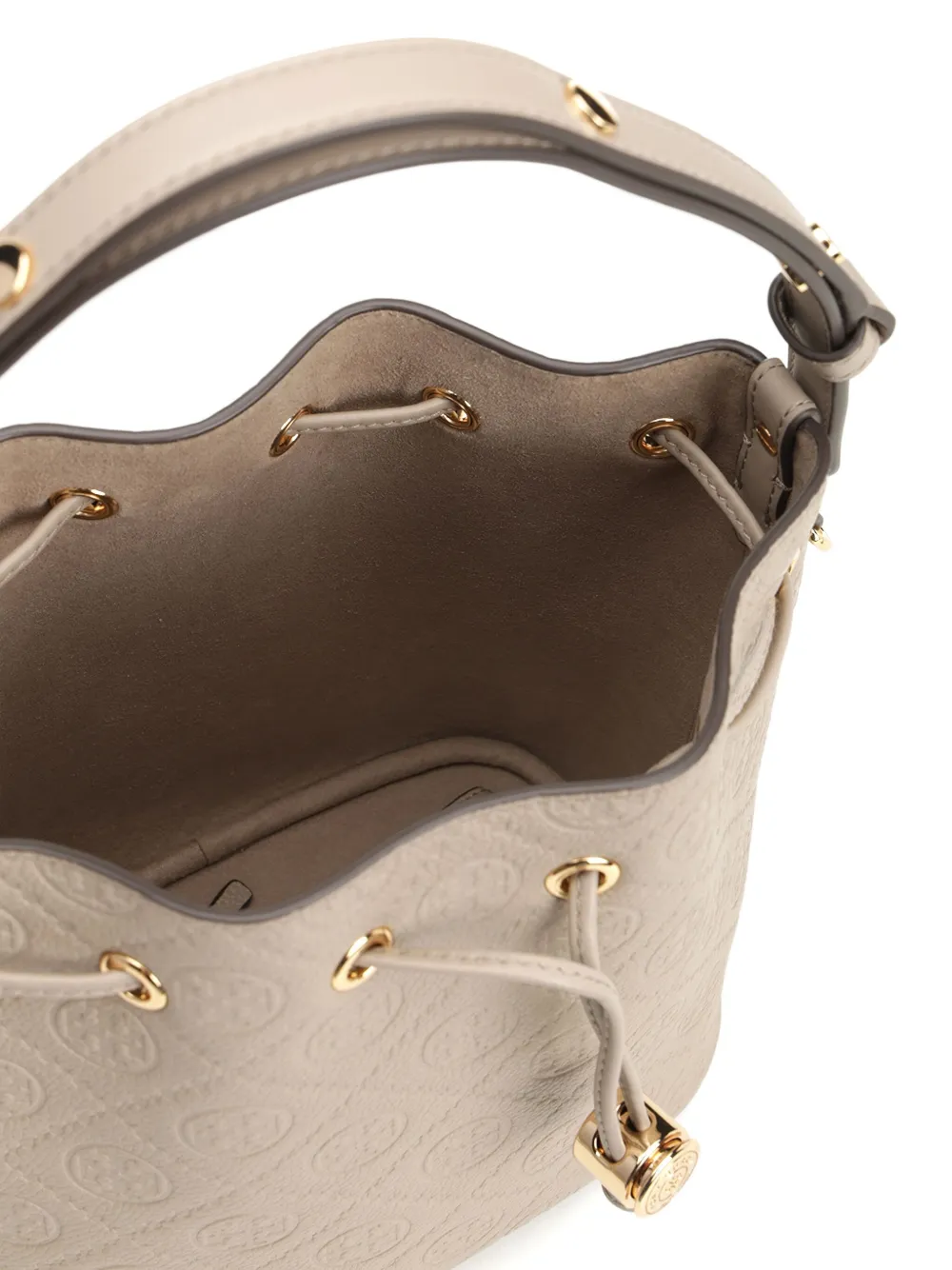 Светло-бежевый тисненый логотип, застежка на шнурок, верхние ручки, съемный плечевой ремень, золотистая фурнитура