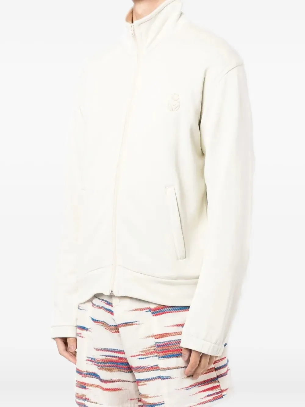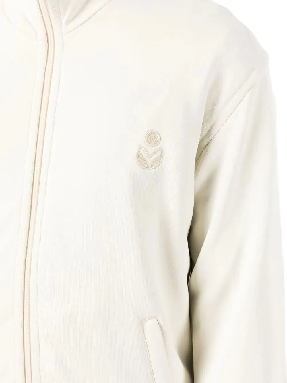 Кремовый, с высоким воротом, застежкой-молнией, длинными рукавами, вышитым логотипом, хлопчатобумажной тканью.