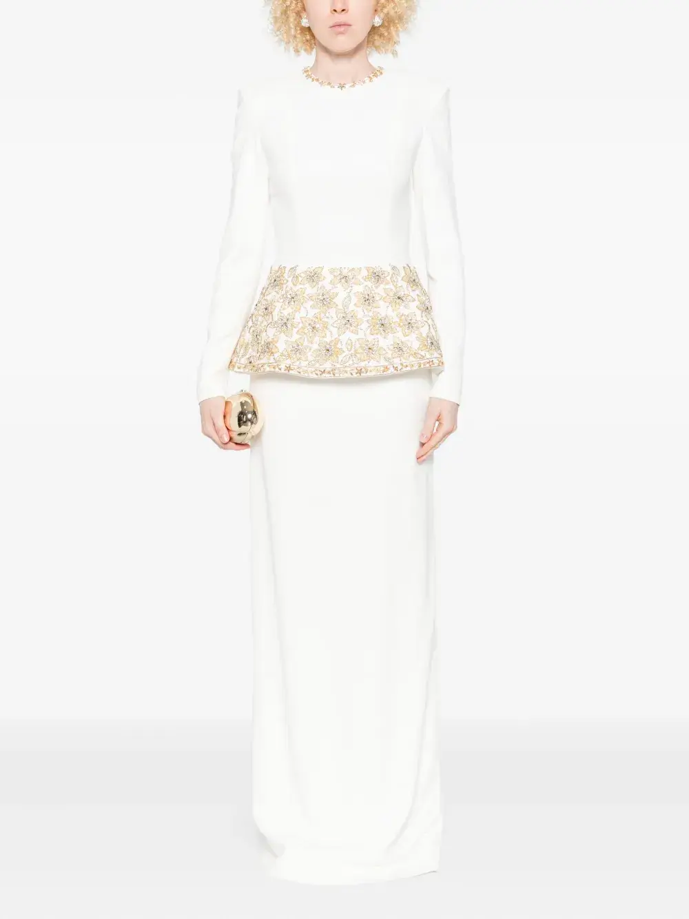 Вышитая баска оттенка белого золота, длинные рукава, круглый вырез, декорированная горловина.