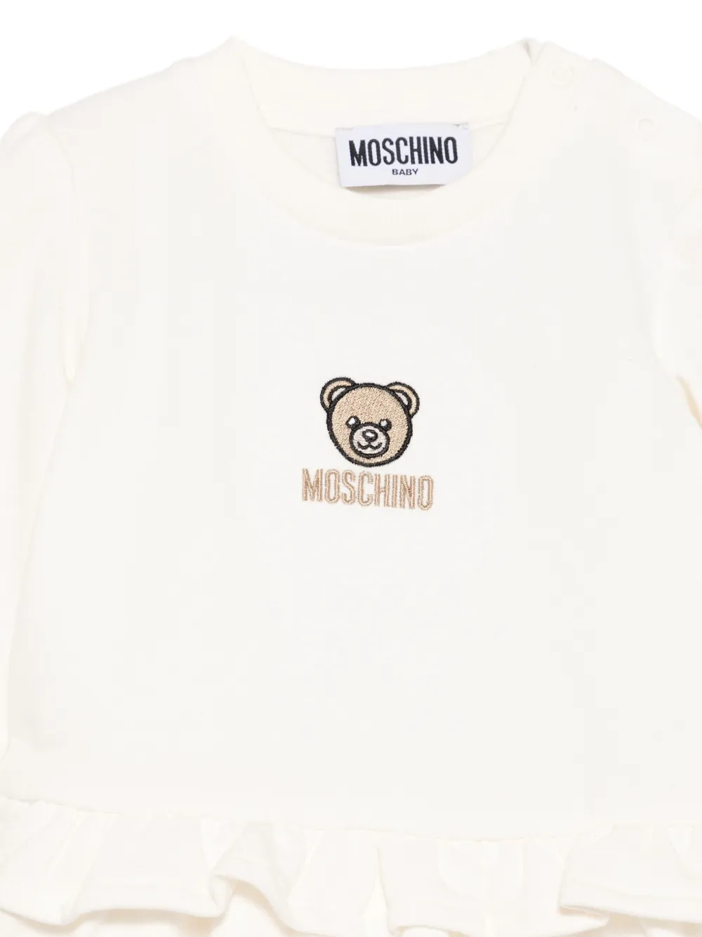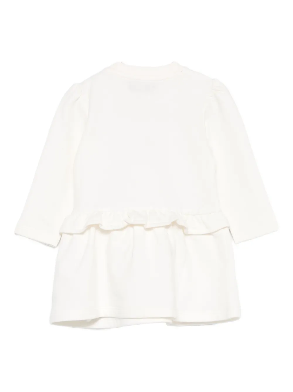 Белый оборчатый подол, длинные рукава, вышитый плюшевый мишка, вышитый логотип, круглый вырез горловины.