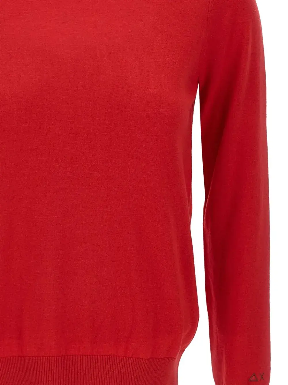 Красный круглый вырез горловины, длинные рукава, ребристые манжеты, вышитый логотип.