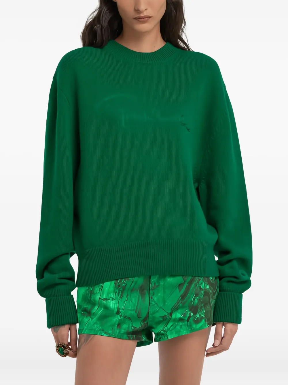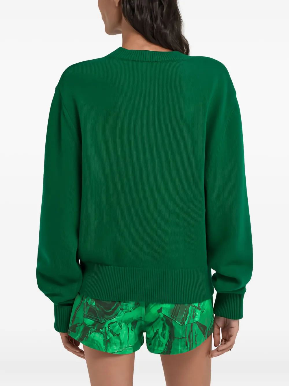 Зеленая девственная шерсть, вышитая деталь, круглый вырез, длинные рукава