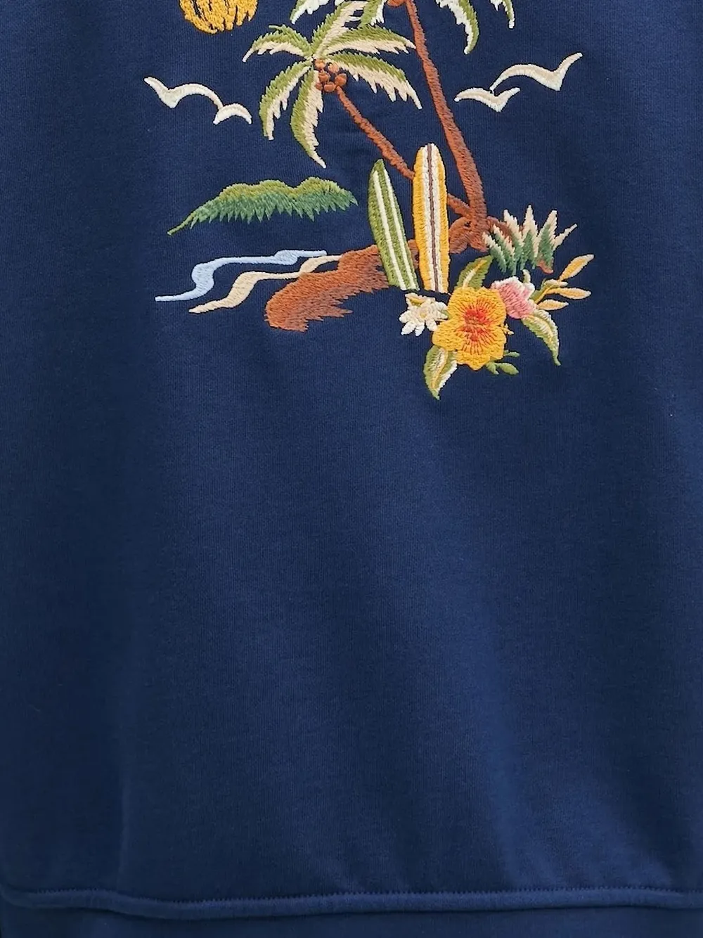 Темно-синяя вышивка с тропическим сюжетом, застежка-молния, ребристые манжеты, ребристый подол.