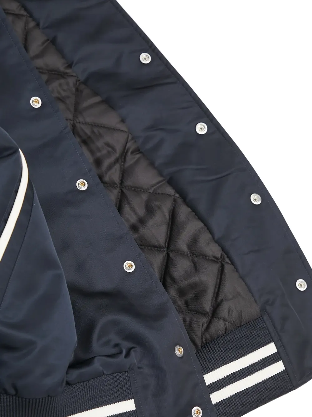 Темно-синяя атласная ткань, ребристая отделка, вышитый логотип, застежка на пуговицы.