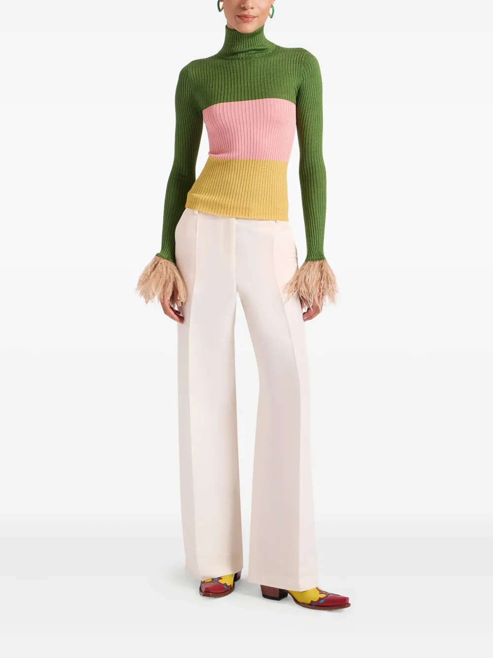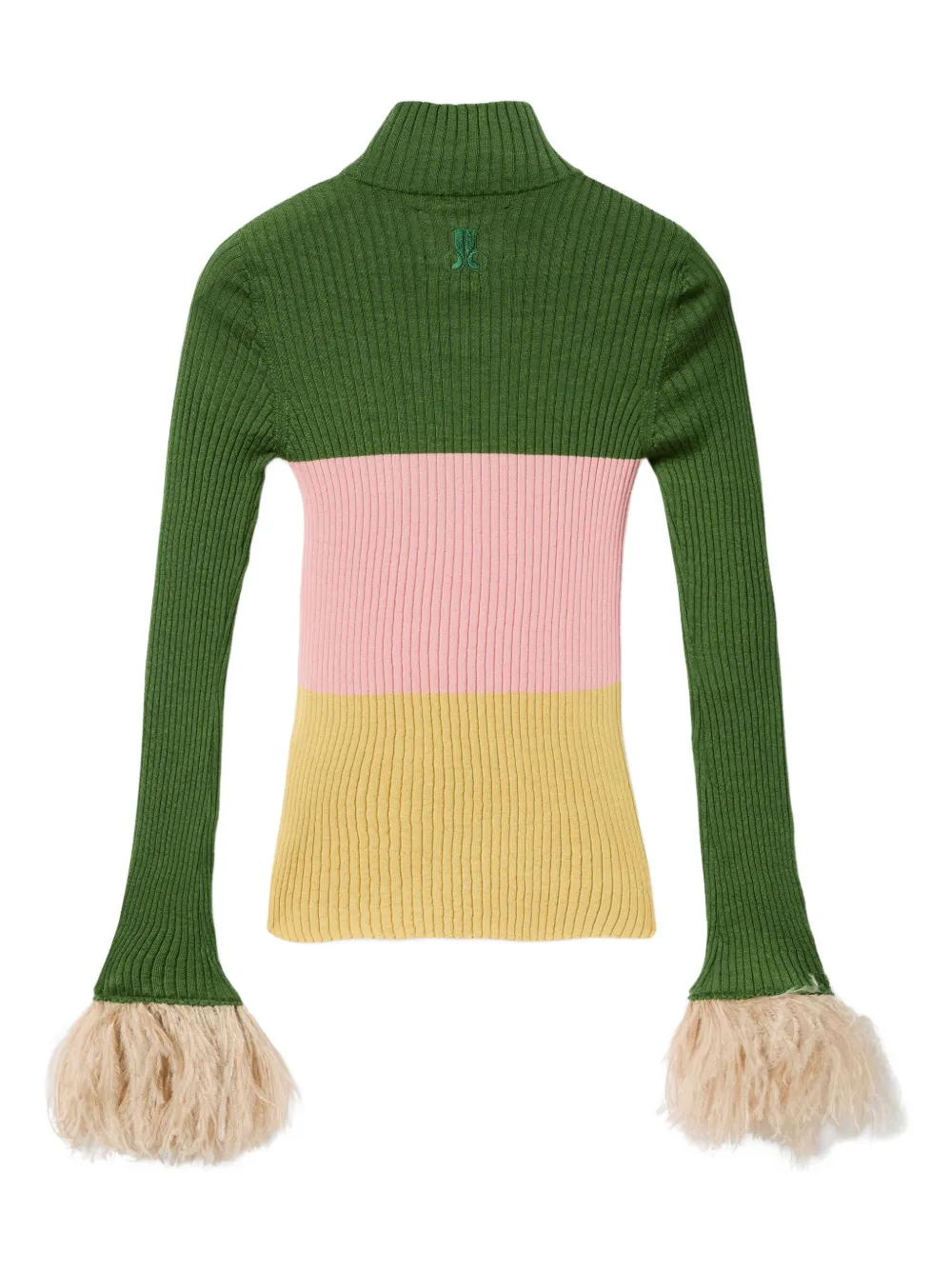 Зеленый трикотаж в рубчик с цветными блоками, высоким воротом и длинными рукавами, отделкой из перьев