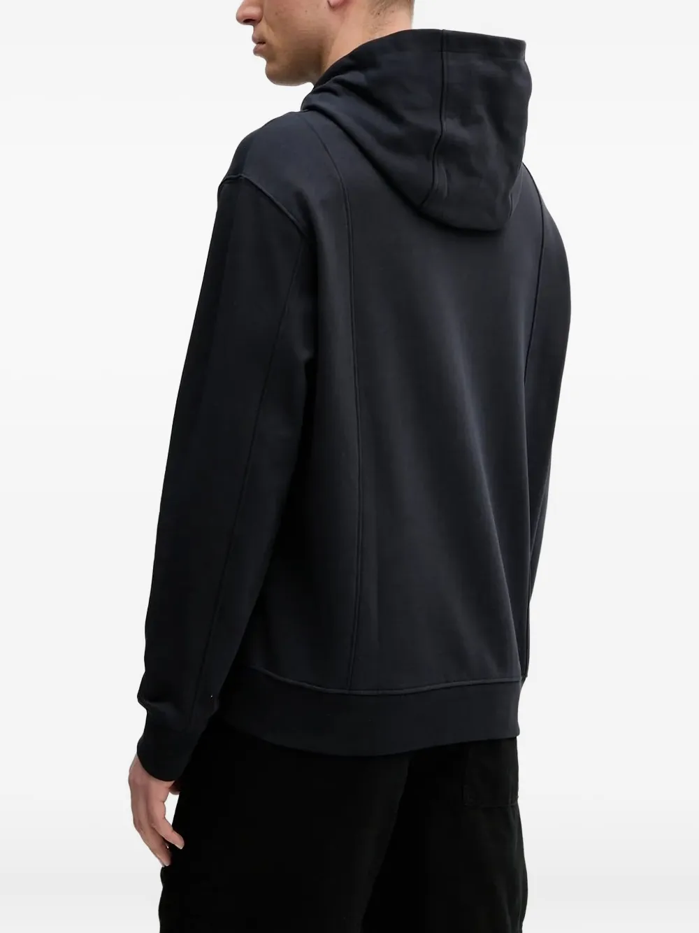 Темно-синий капюшон, логотип, панельный дизайн, длинные рукава, прямой подол.