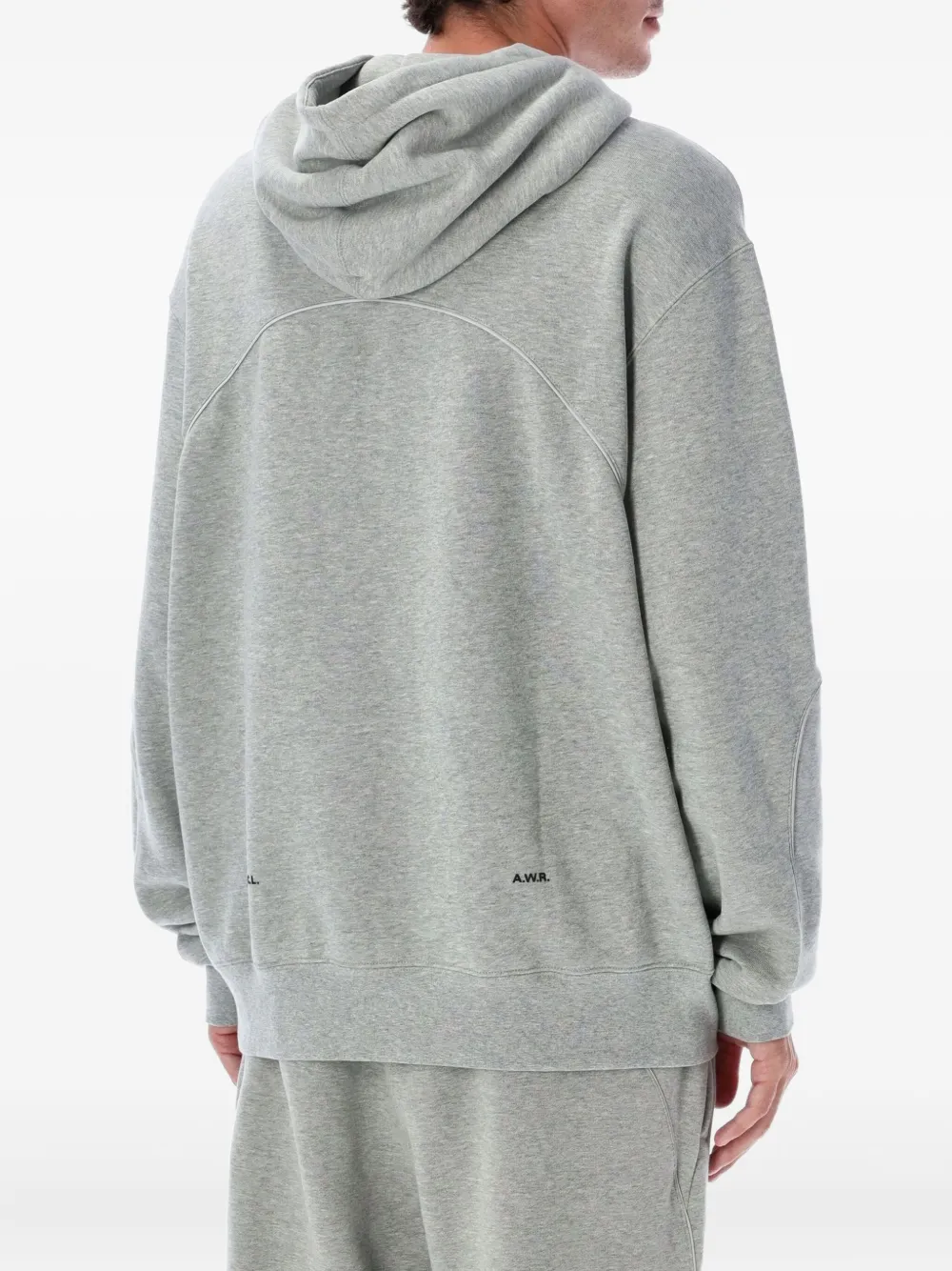 Серый вышитый логотип, карман-кенгуру, капюшон на шнурке, ребристый подол, ребристые манжеты.